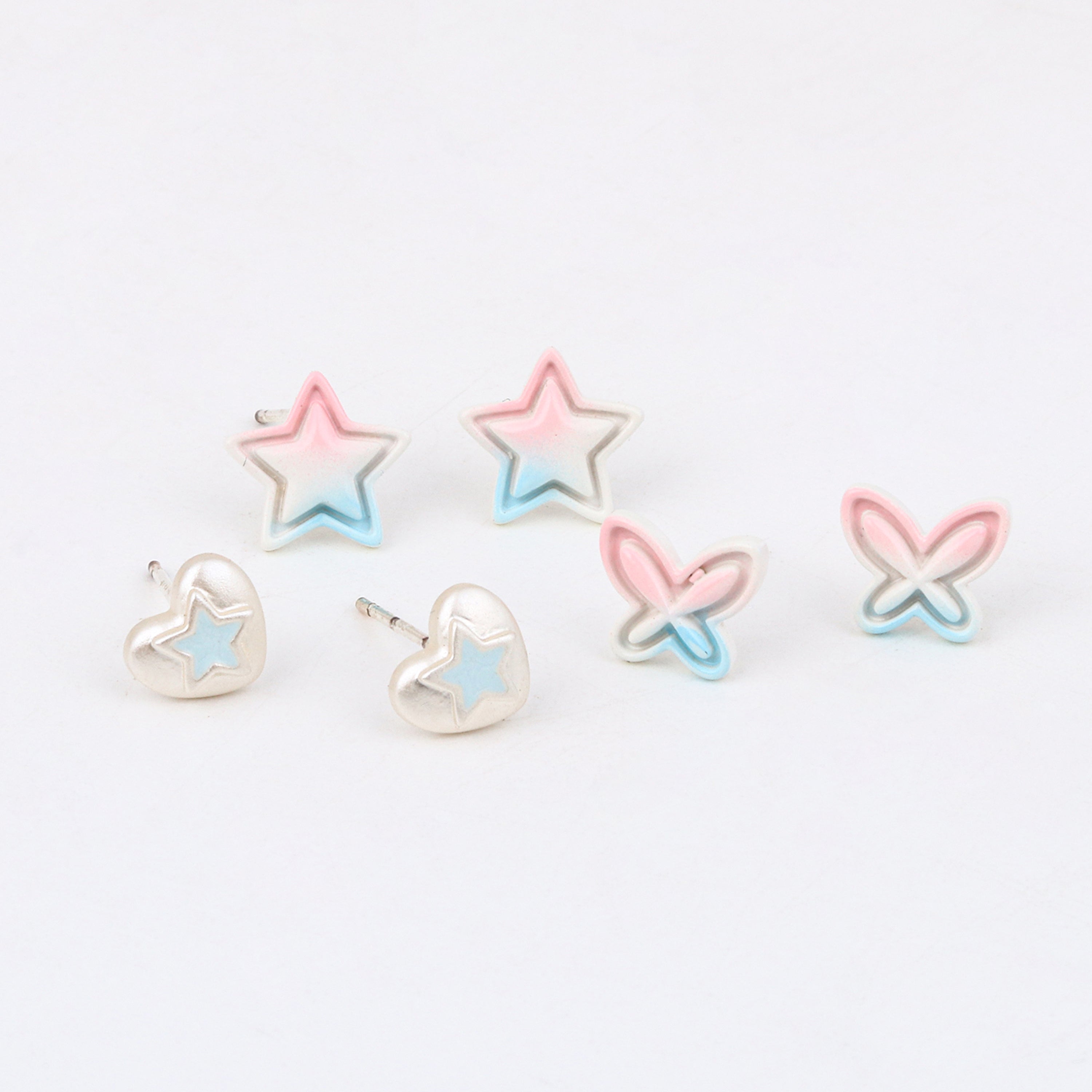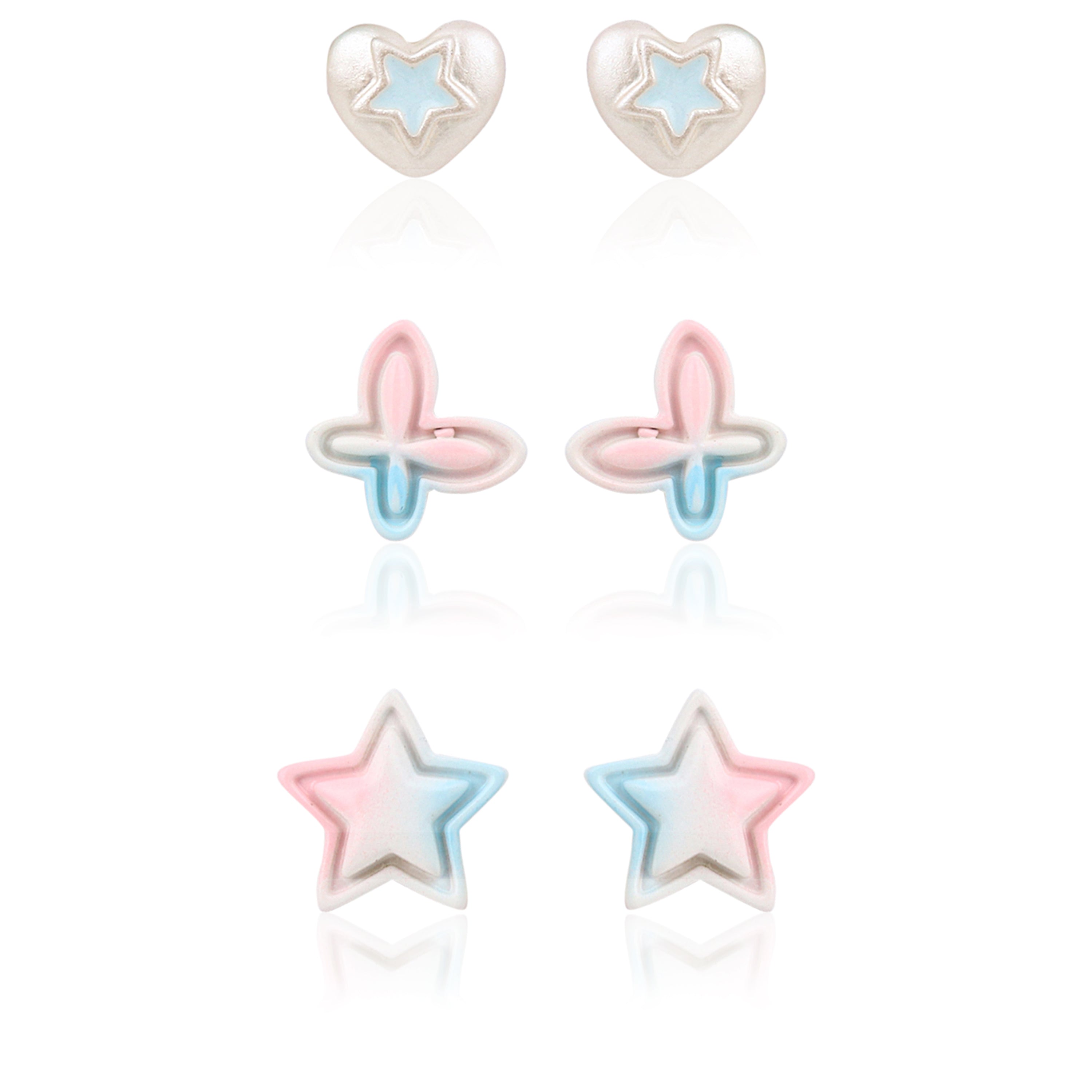 This adorable set includes three pairs of hypoallergenic stud earrings (Star, Heart, and Butterfly). Featuring a dazzling iridescent finish with soft pastel colors (pink/blue), they are perfect for everyday wear. Comfort-fit backs ensure they stay secure and feel great for little ears.