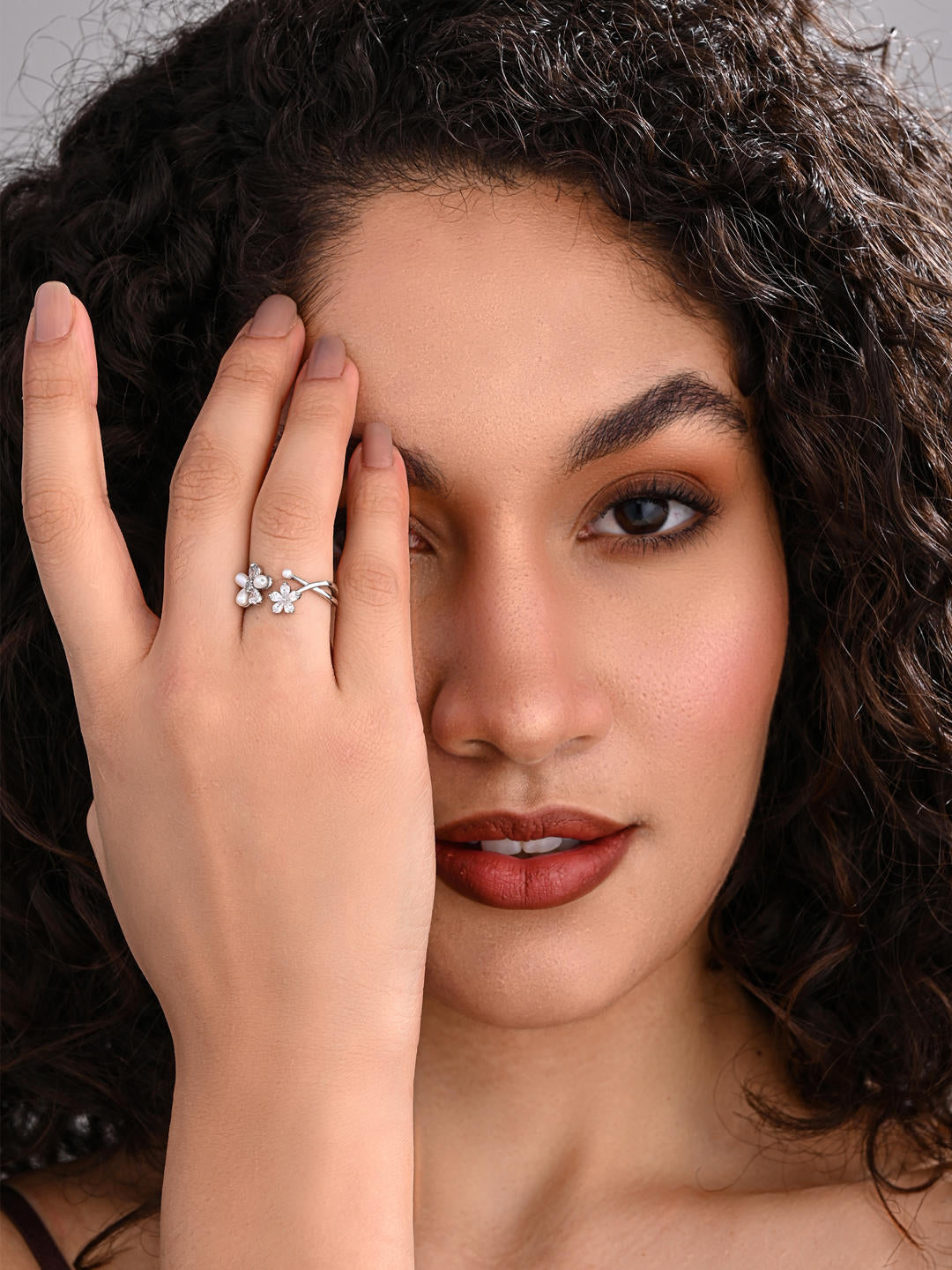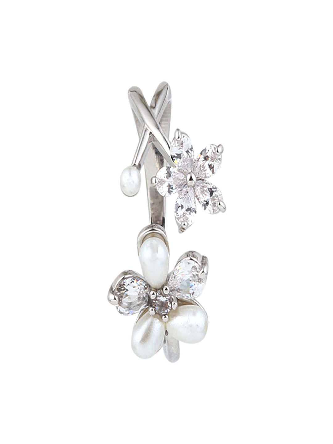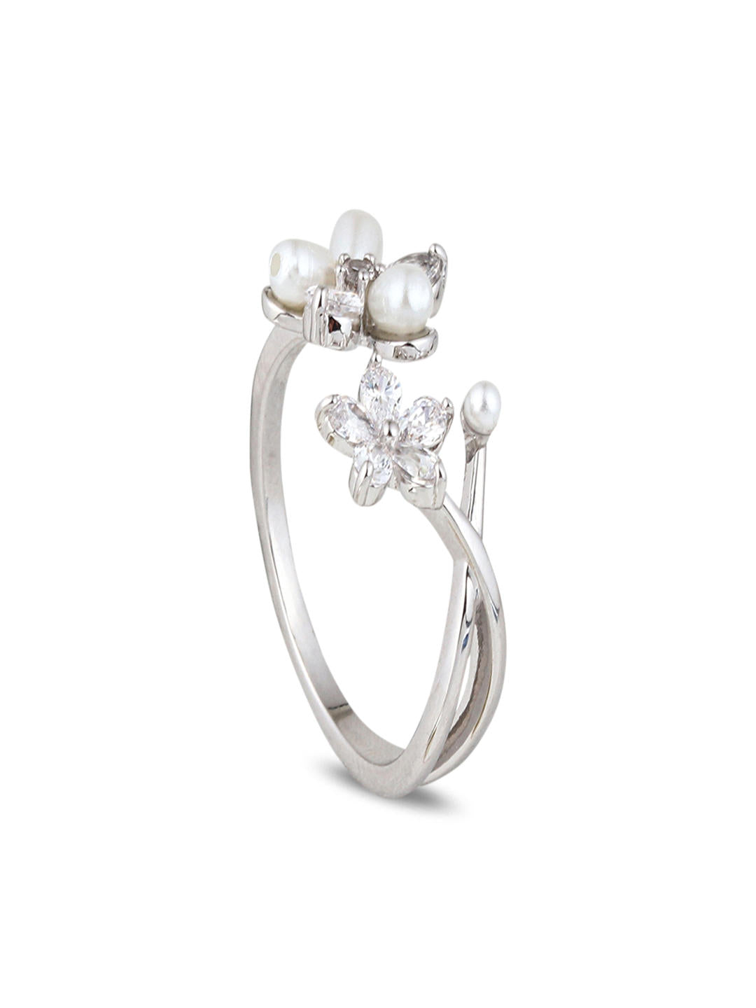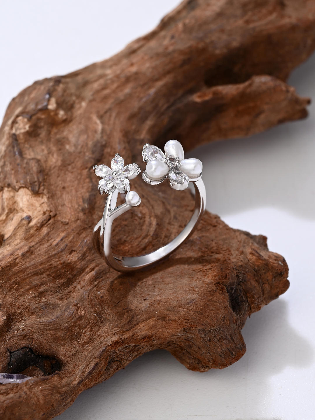 A graceful two-flower design featuring a shimmering CZ floral motif paired with soft pearl petals. Adjustable for a perfect fit, this silver ring adds a fresh and feminine touch to every look — from daily elegance to special occasions.
