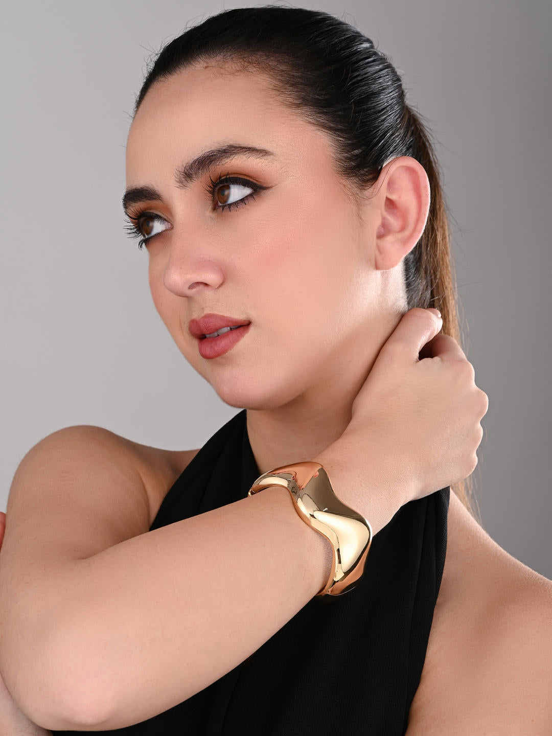 Turn heads with this sculptural wavy gold-tone cuff bracelet. Featuring a fluid, modern design and a high-shine finish, this piece adds a contemporary edge to any look. Lightweight yet striking, it’s perfect for fashion-forward styling — day or night.