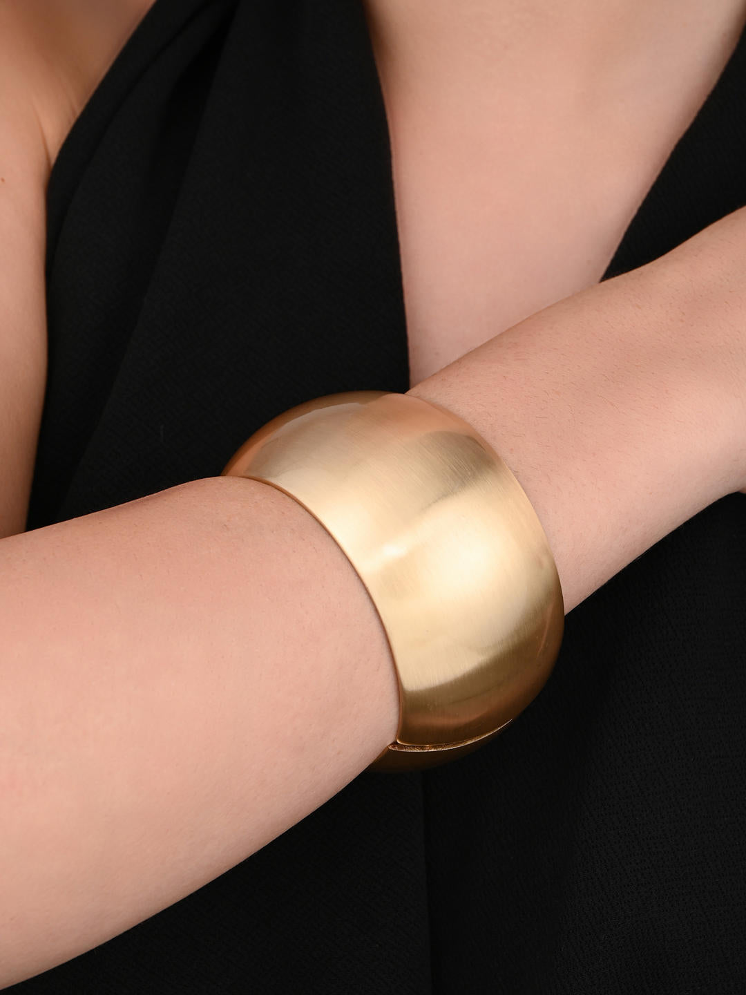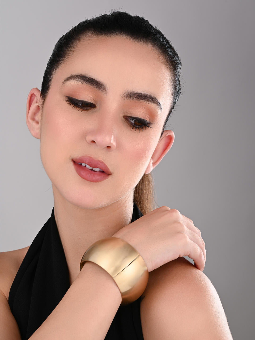 Make a bold style statement with this elegant wide cuff bracelet. Featuring a smooth gold-tone finish and a lightly textured inner surface, it offers a sleek, minimalist look perfect for any outfit. Lightweight and comfortable, this timeless piece adds a touch of luxury to your everyday or evening wear.