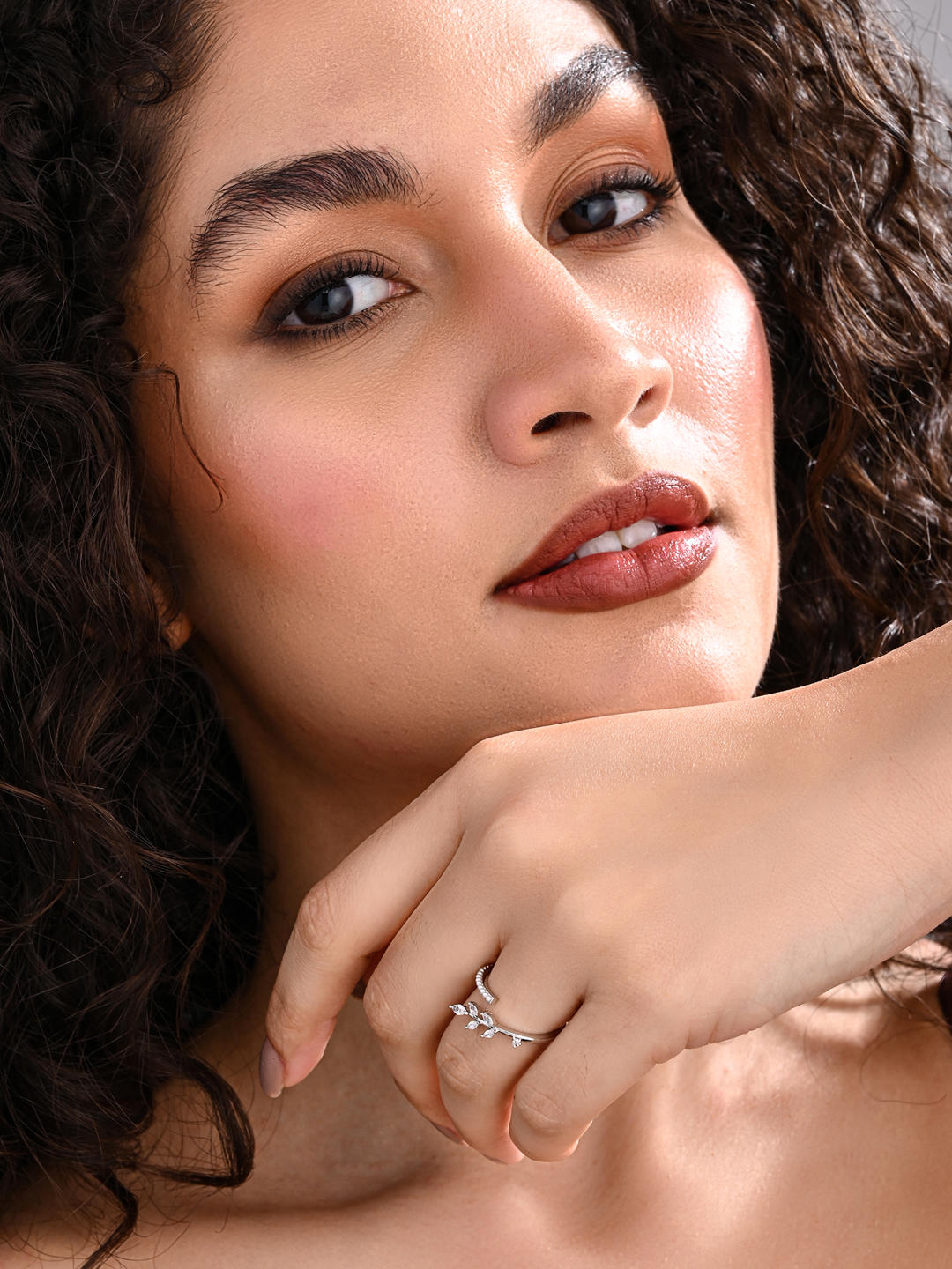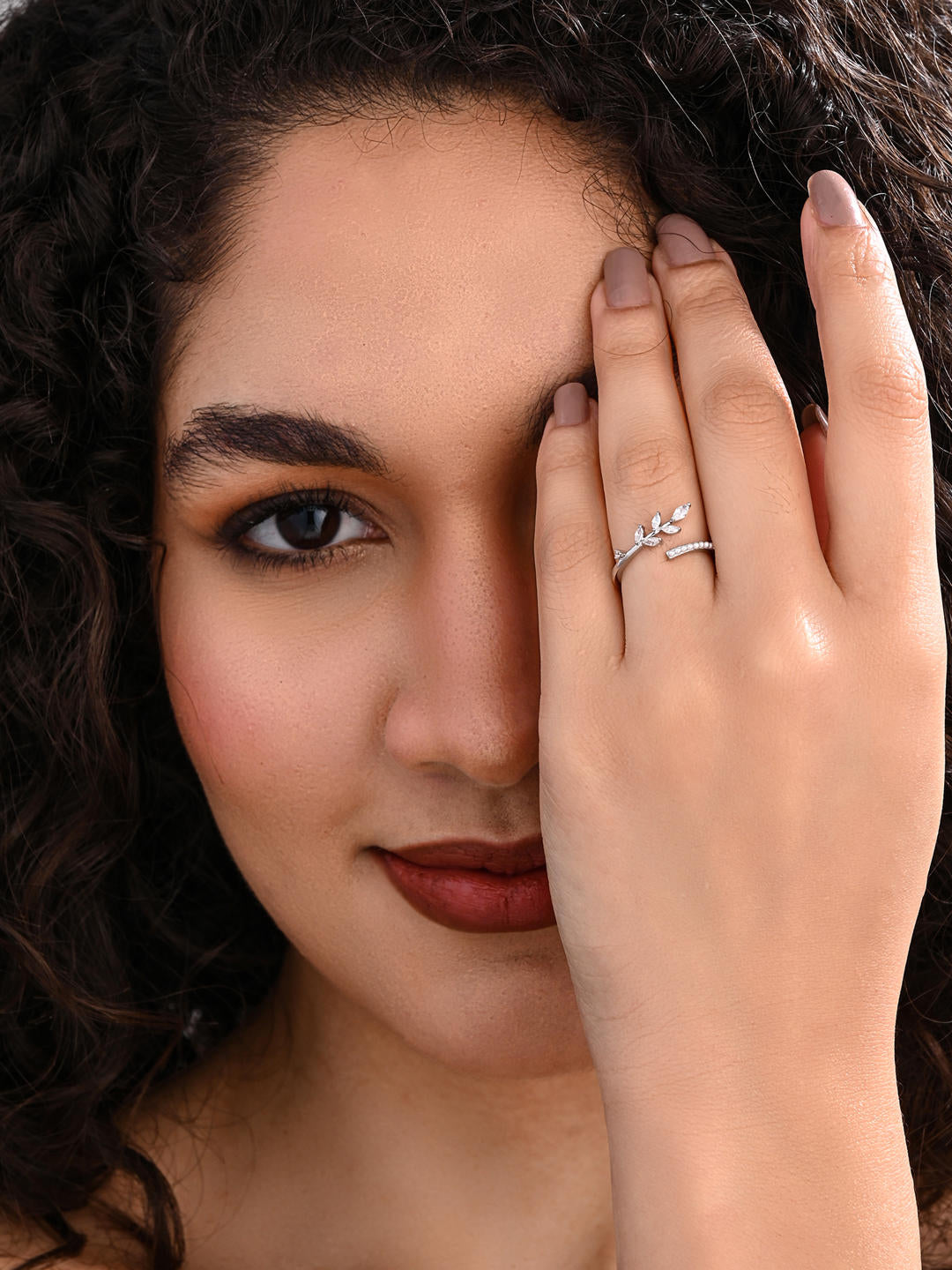 Inspired by fresh morning dew, this elegant vine-style ring features marquise CZ stones and a sleek curved band for the perfect graceful sparkle. Adjustable and lightweight — ideal for everyday chic and occasion wear alike.