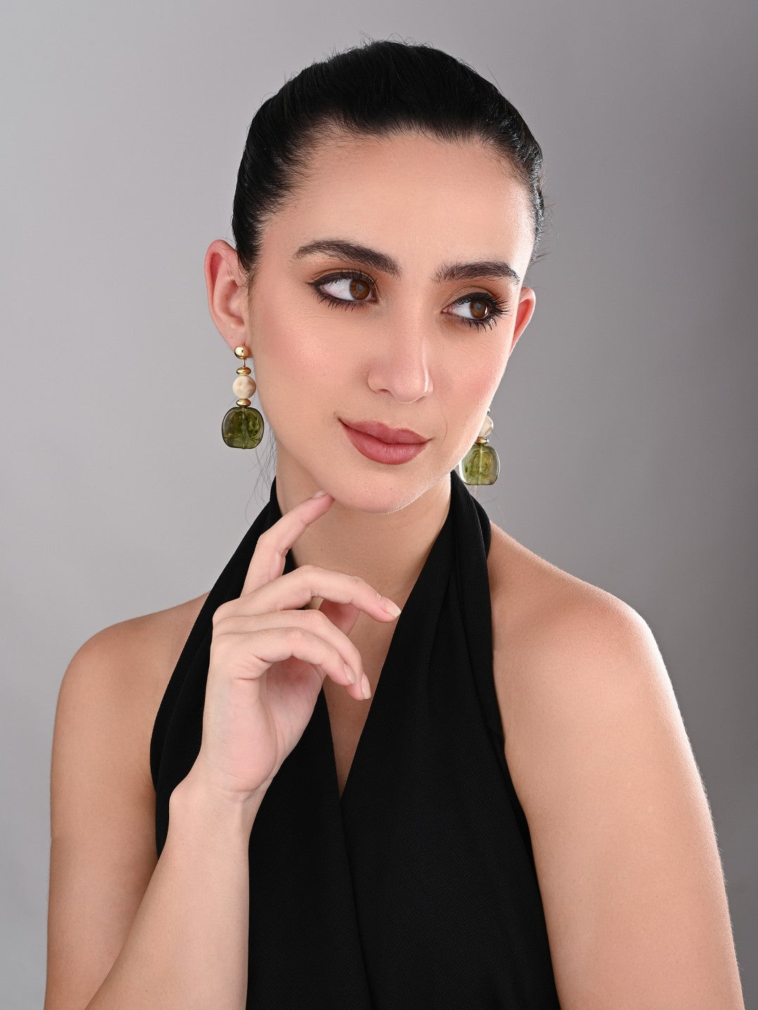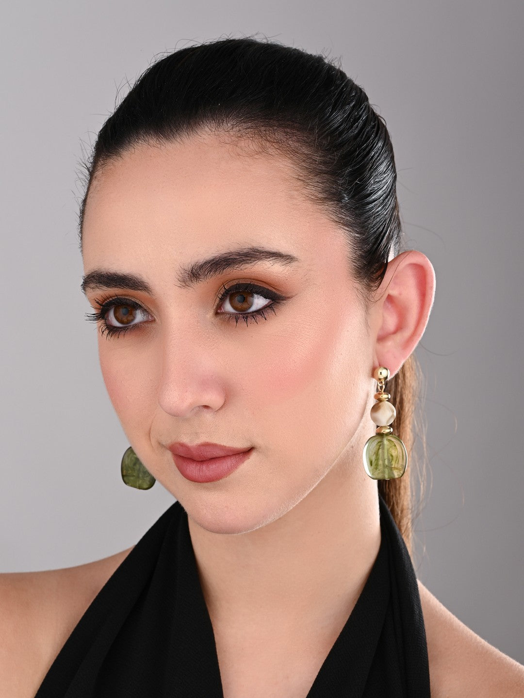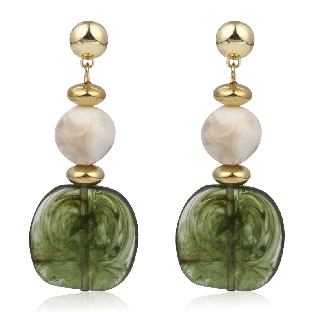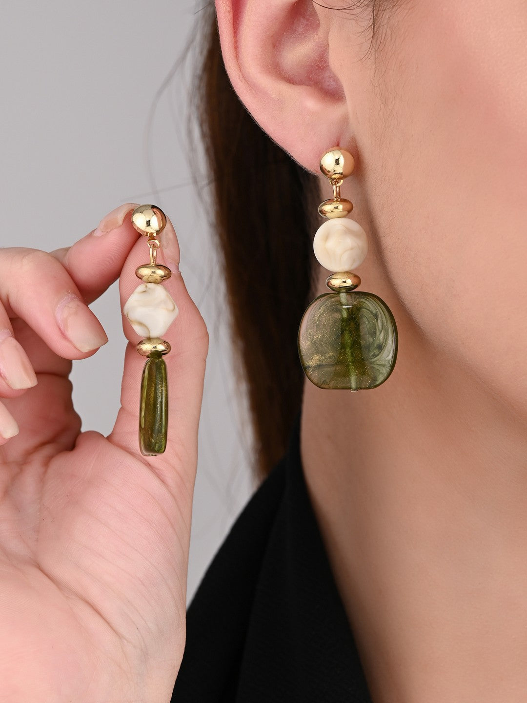 Deep green resin with swirls of gold, paired with pearly accents and golden touches. A statement piece that captures the beauty of ocean waves.