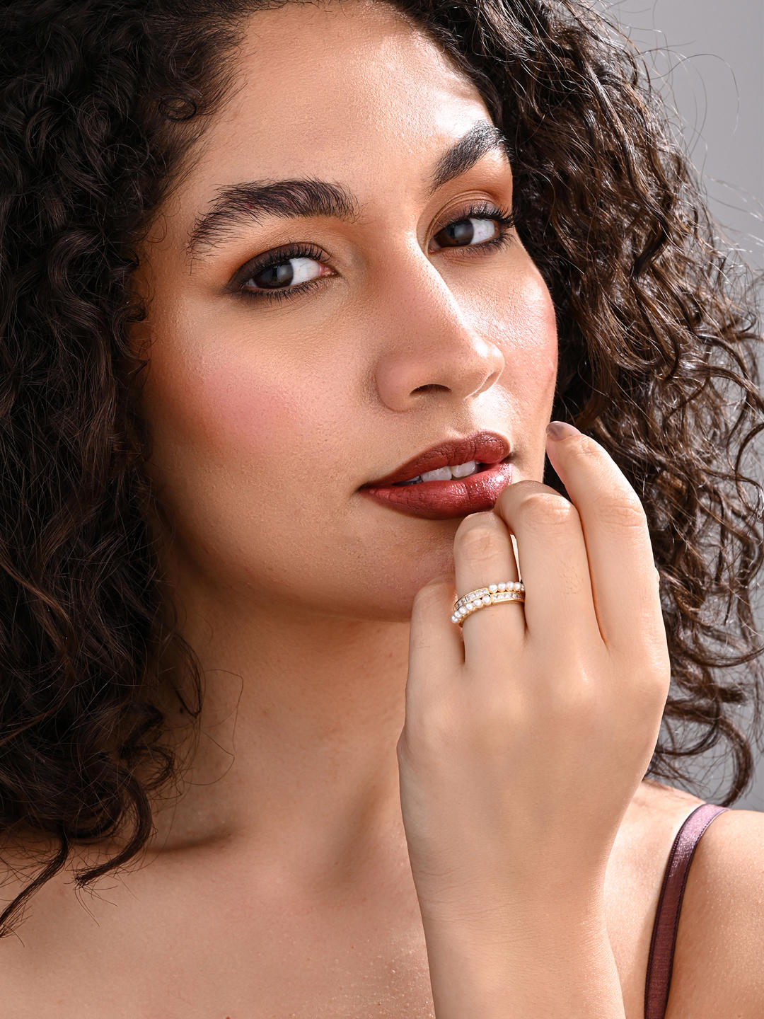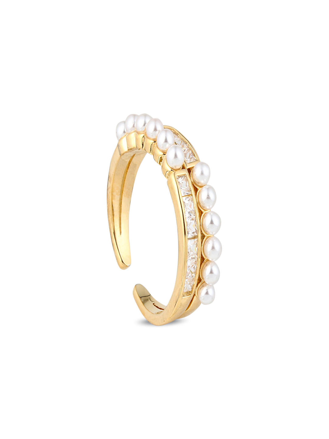 A luxe adjustable ring crowned with two rows of luminous pearls and sparkling stones, set on a radiant gold base. Elegant and versatile — a perfect blend of modern glamour and classic charm.