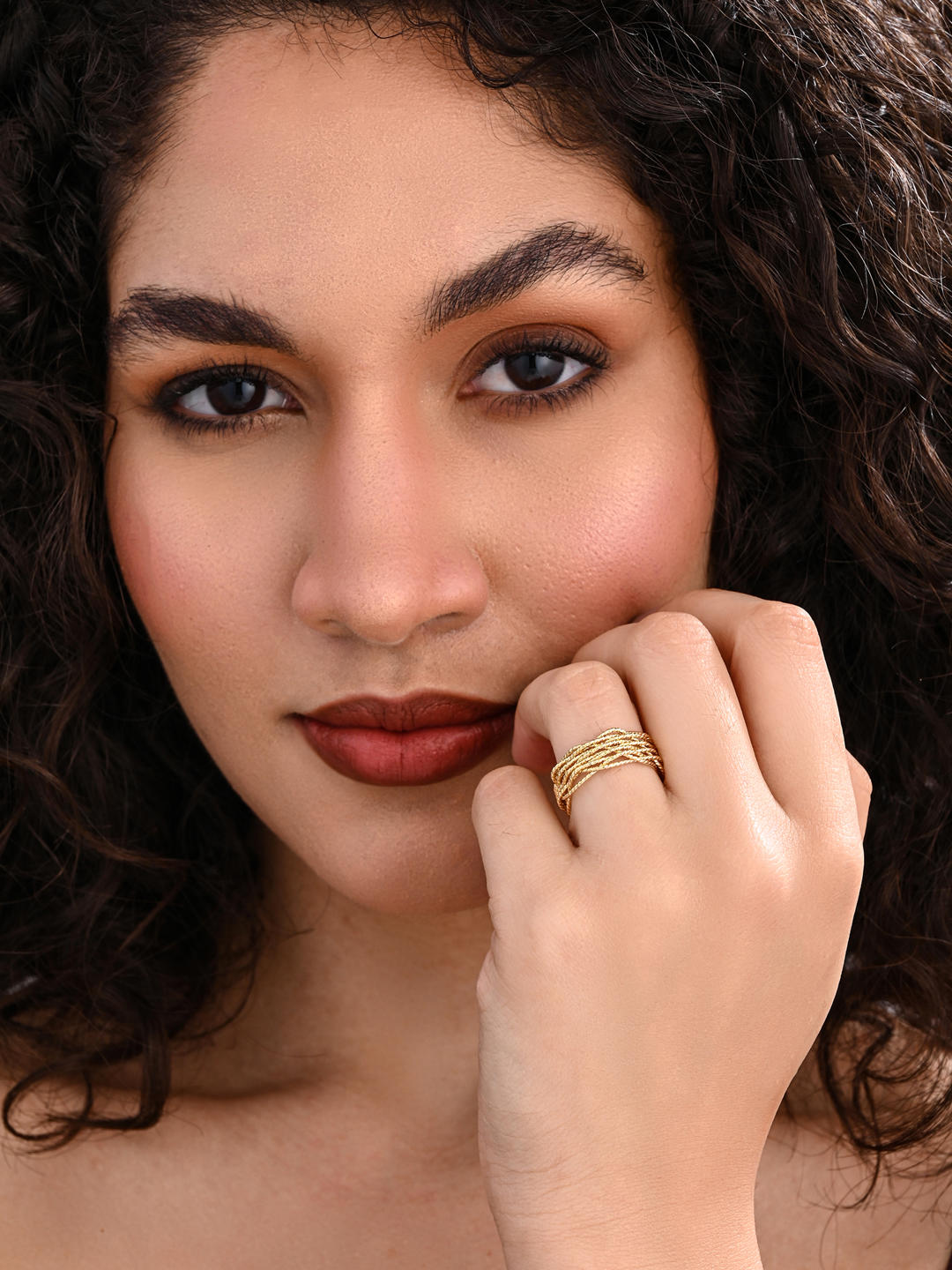 A beautifully layered gold-tone band with rich textured detailing that mimics rippling waves. Bold yet minimal, this adjustable ring adds instant luxury and dimension to any look.