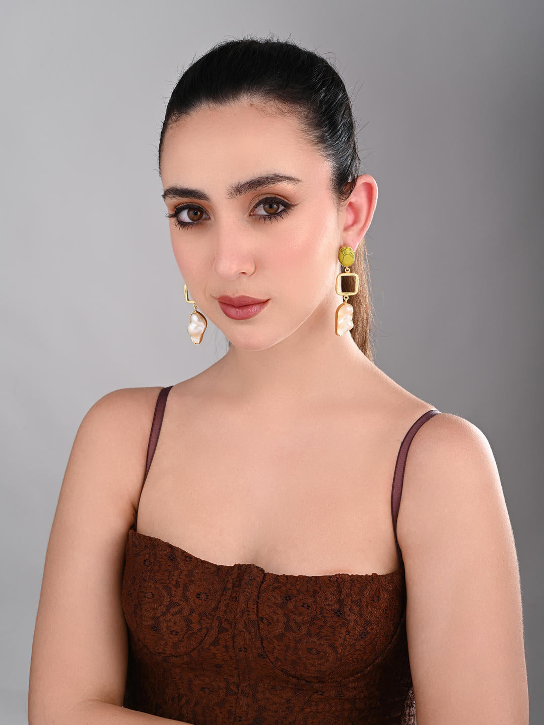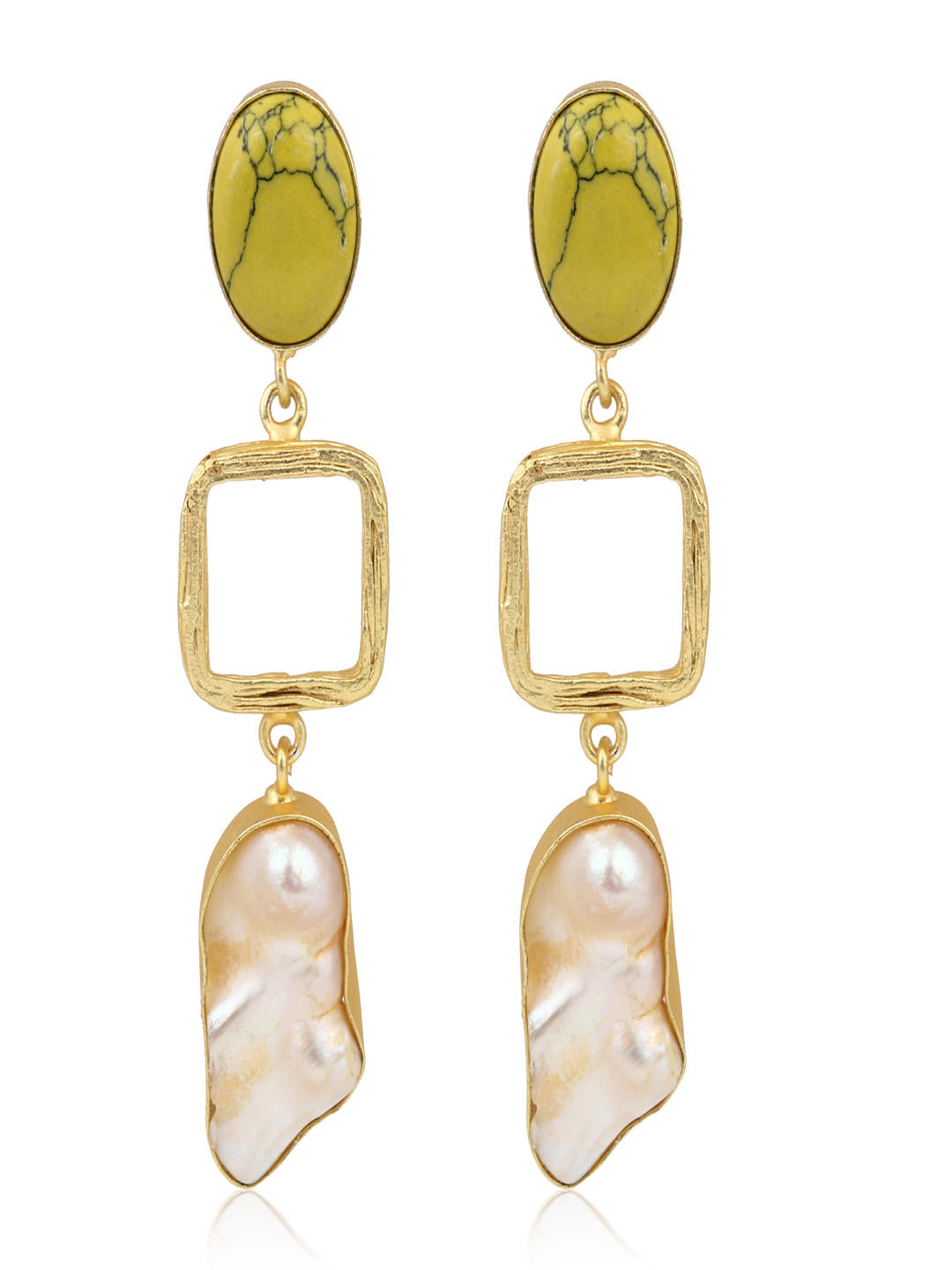 Vibrant green gemstone tops paired with textured gold frames and baroque pearl drops, blending modern design with natural beauty.