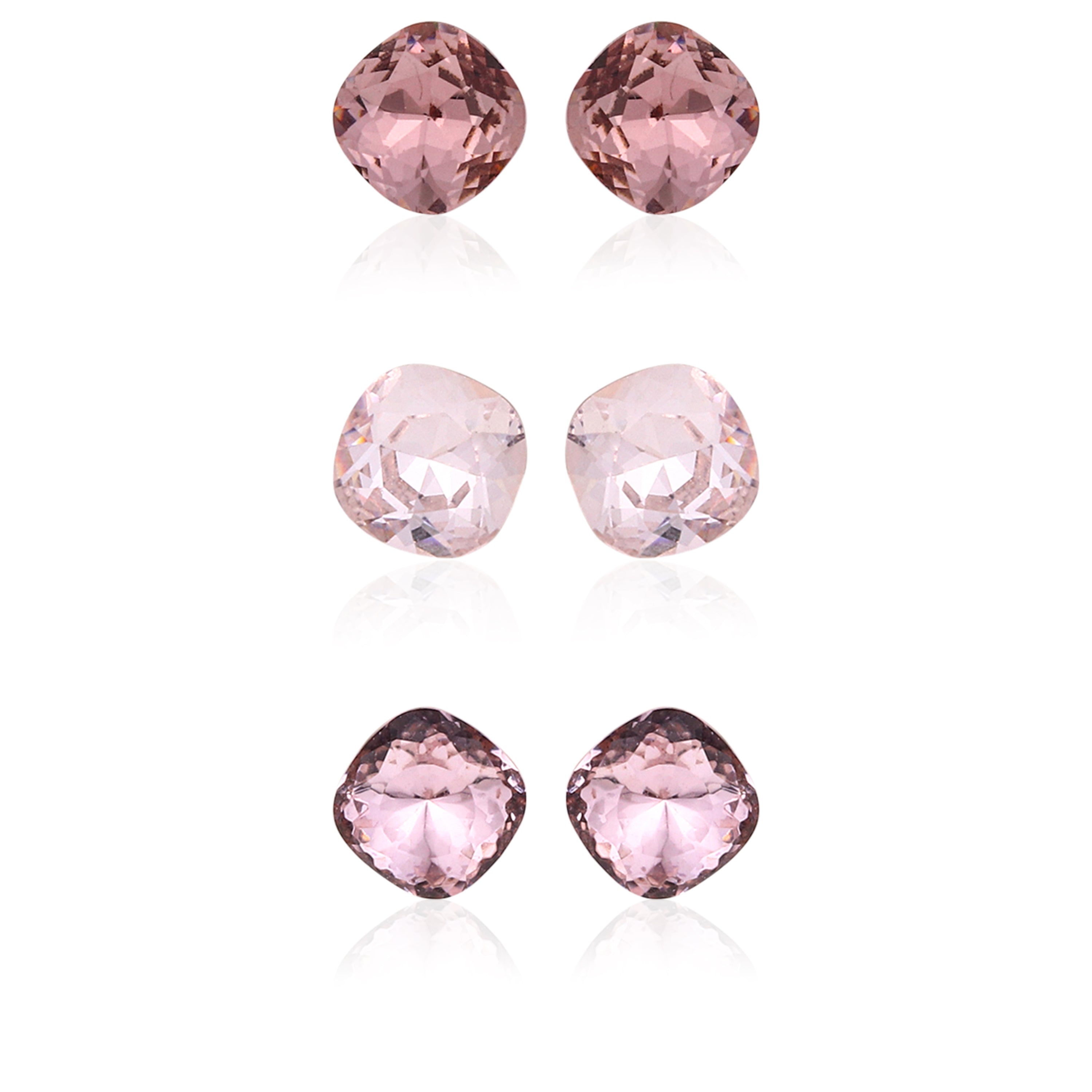 A beautiful and coordinating three-pair set of hypoallergenic 925 Sterling Silver stud earrings. Each pair features a dazzling Square or Cushion Cut Cubic Zirconia stone, showcasing lovely tones of Lavender, Iridescent Pink, and deep Amethyst Purple. A perfectly subtle pop of color for sensitive ears.