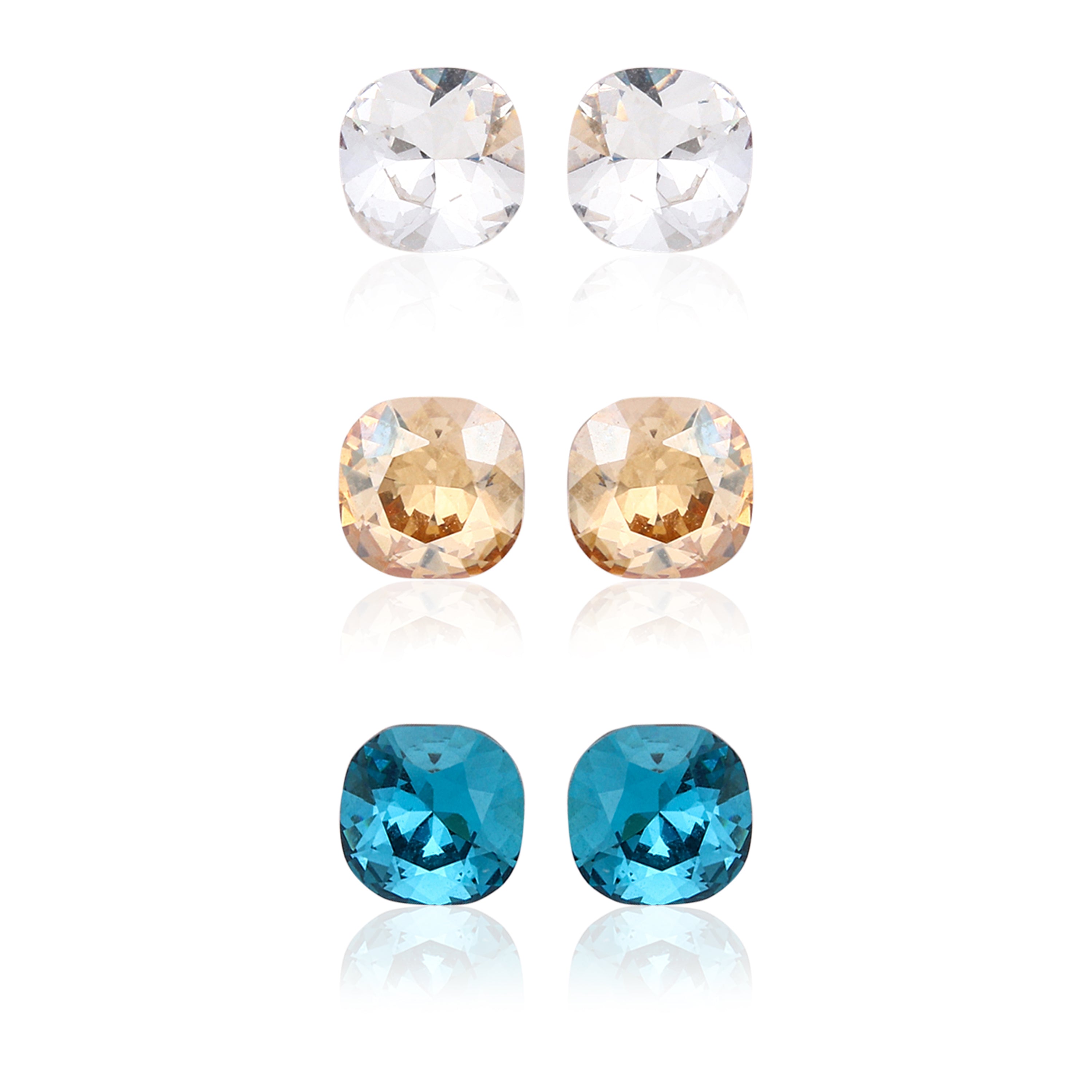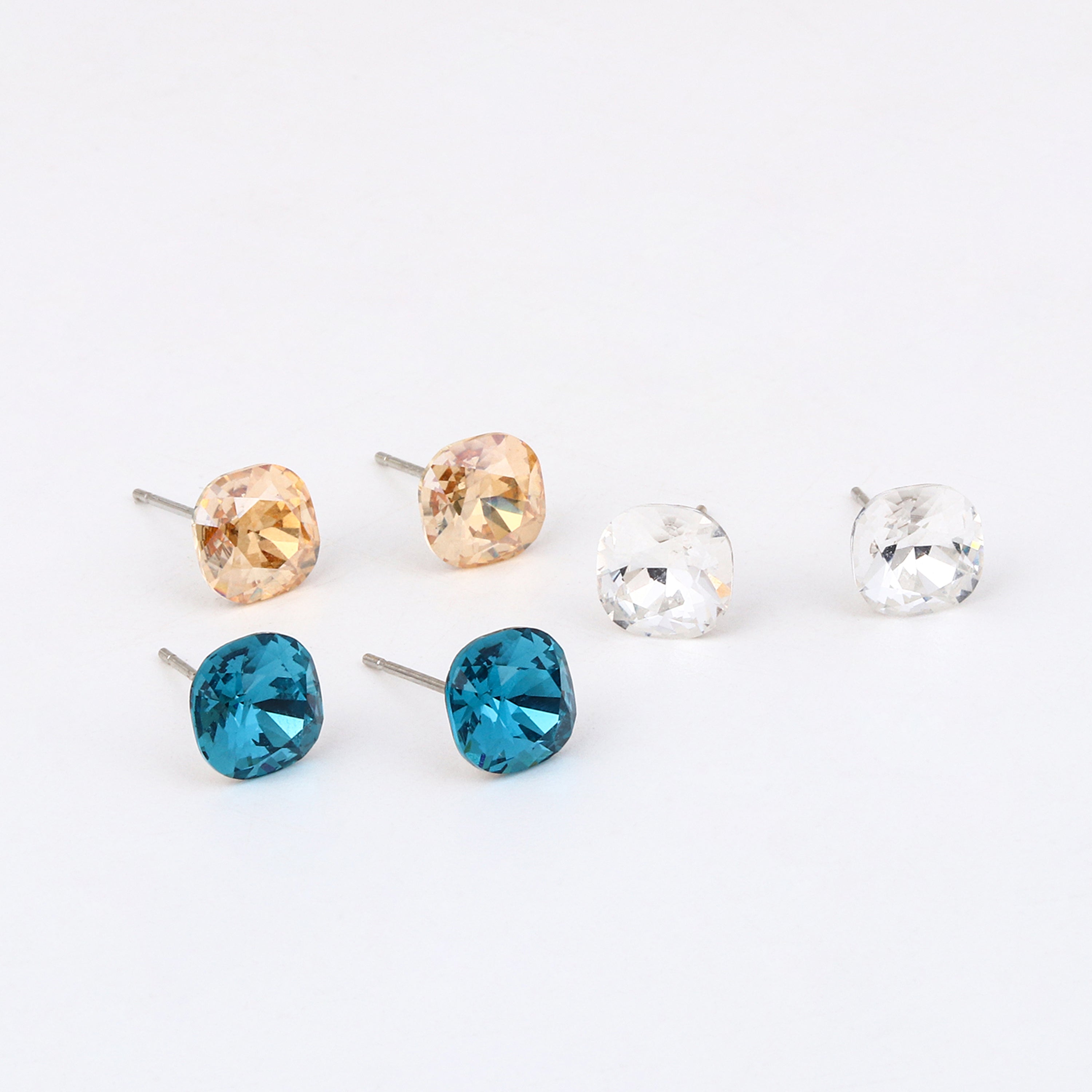 This gorgeous trio of hypoallergenic 925 Sterling Silver stud earrings features sparkling Square or Cushion Cut Cubic Zirconia stones in three rich colors: Clear White, Warm Champagne, and a bold Teal Blue. These versatile studs are perfect for sensitive ears and add a fun pop of color to any outfit.