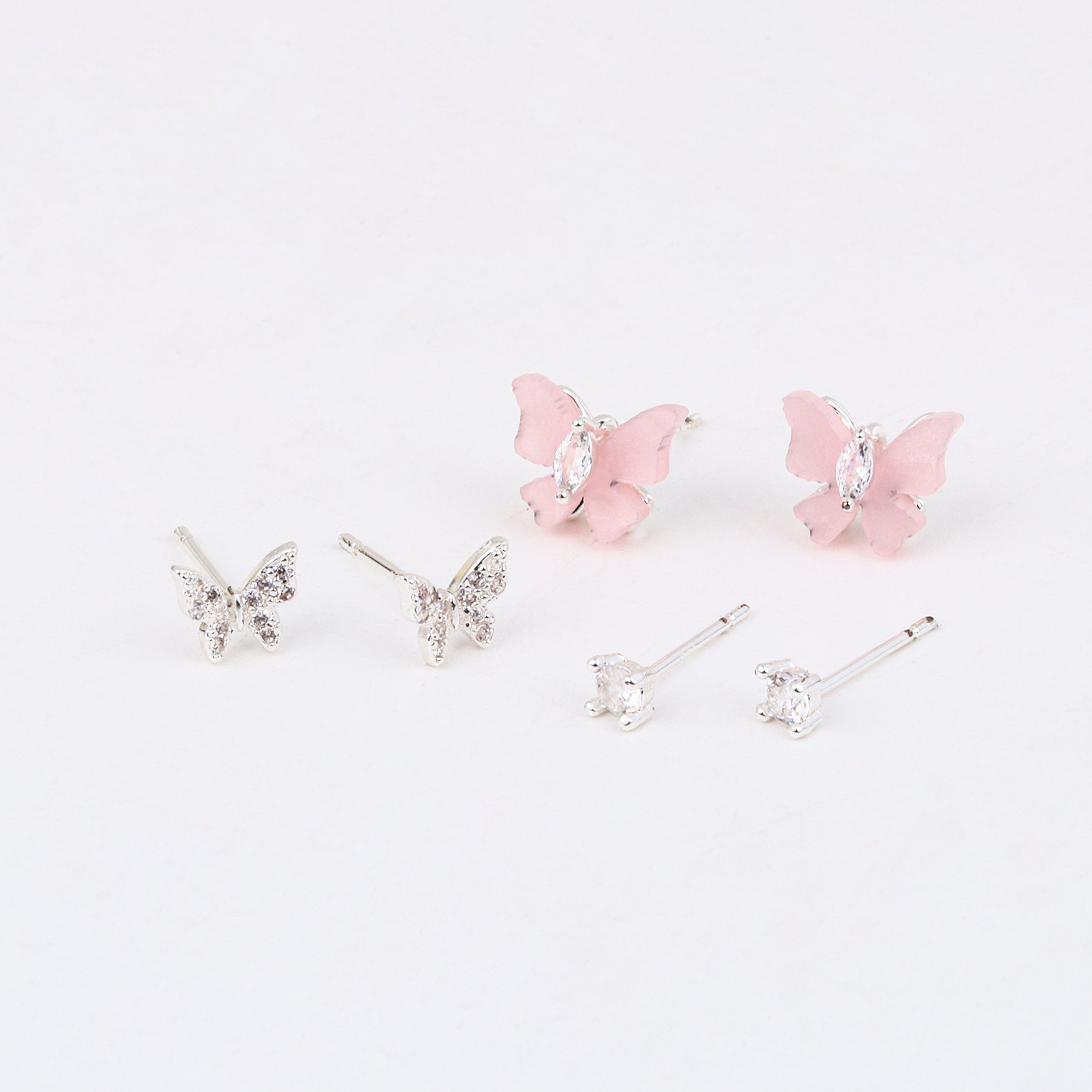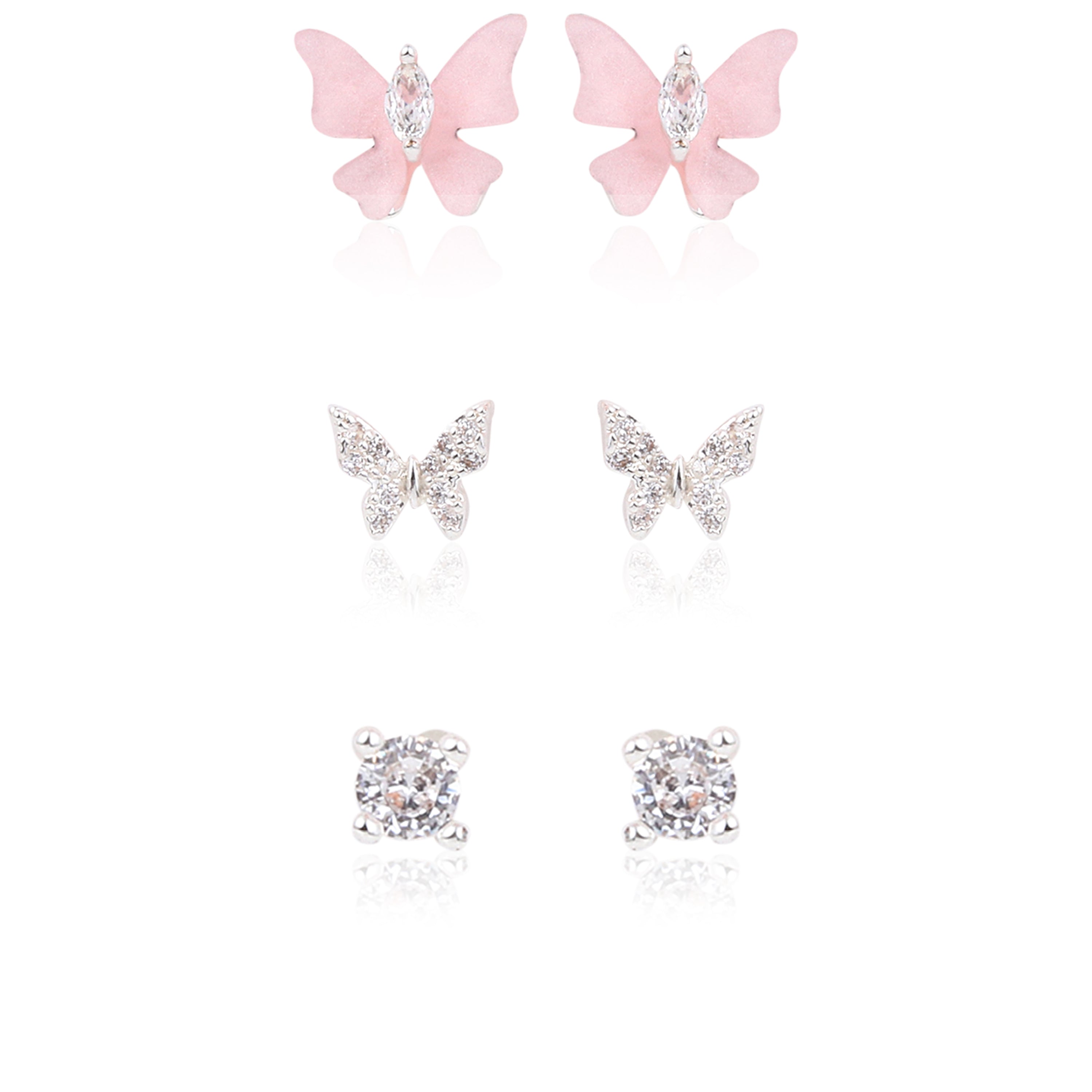 This sweet three-pack includes hypoallergenic 925 Sterling Silver earrings: a pair of vibrant blue butterfly studs, a pair of openwork butterfly silhouettes, and a pair of simple mini studs. Easy to wear and kind to sensitive skin.