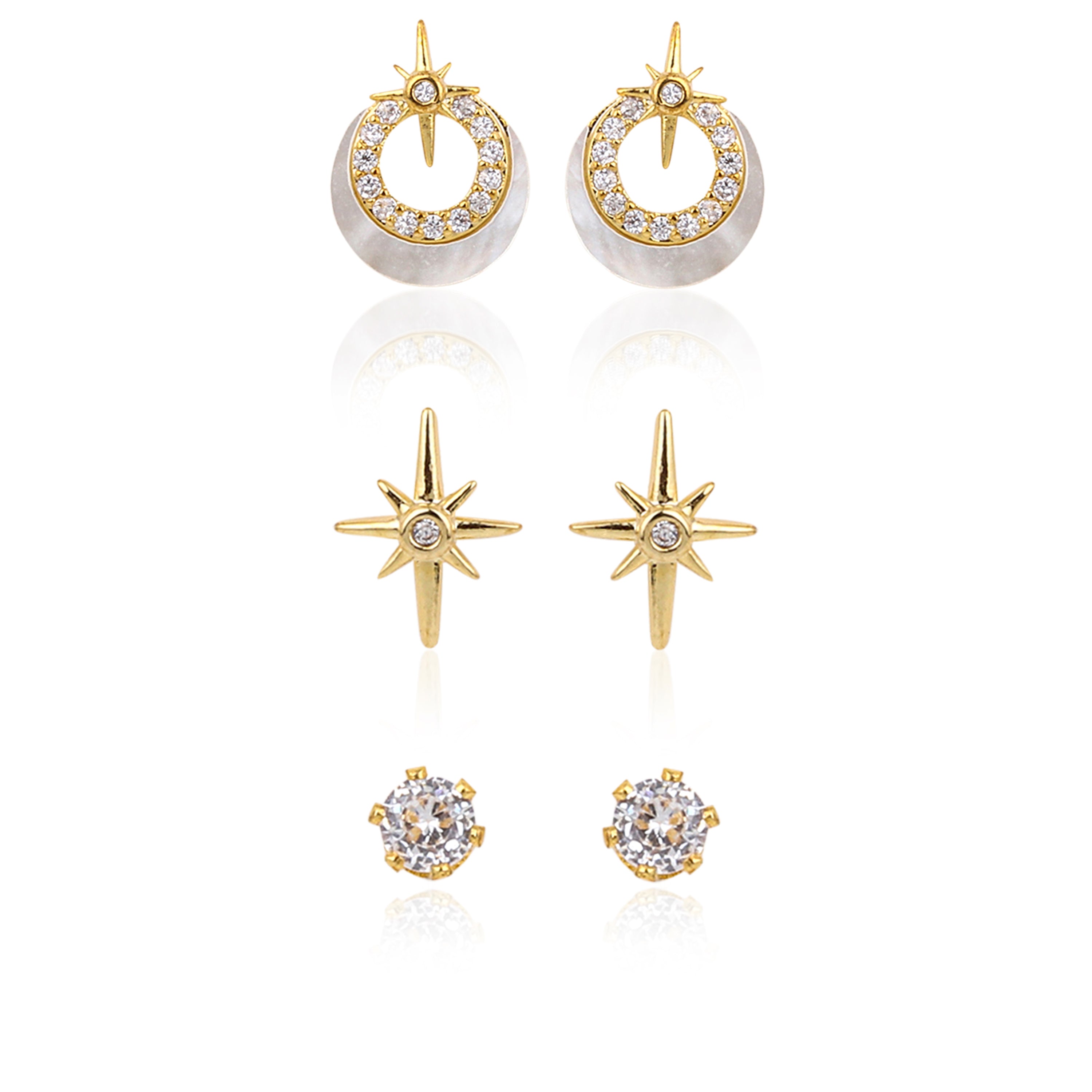 This charming three-pack includes dainty 925 Sterling Silver earrings: a pair of white-enamel moon hoops, a pair of tiny clear studs, and a pair of sweet star studs. Perfect for everyday sparkle.