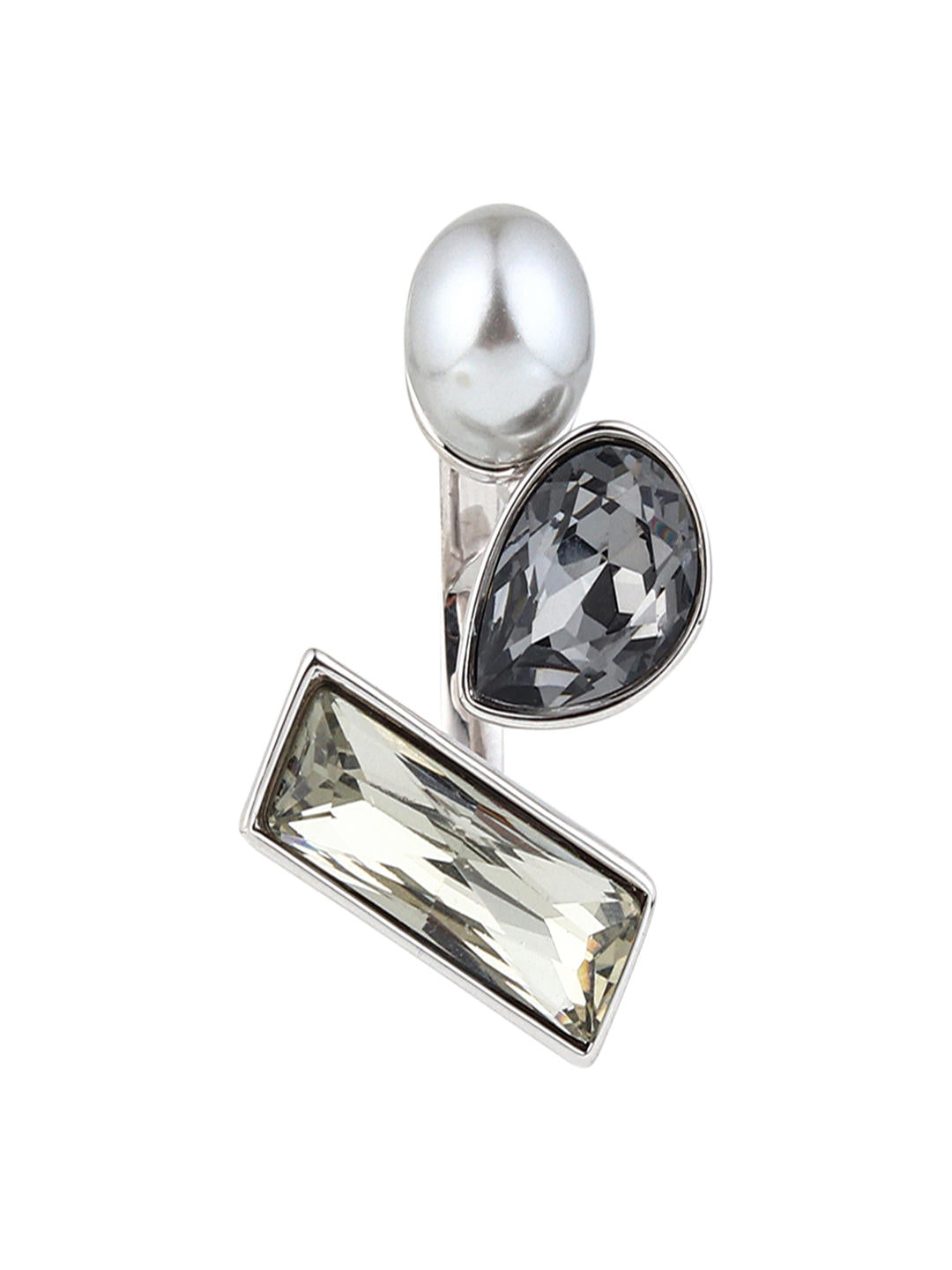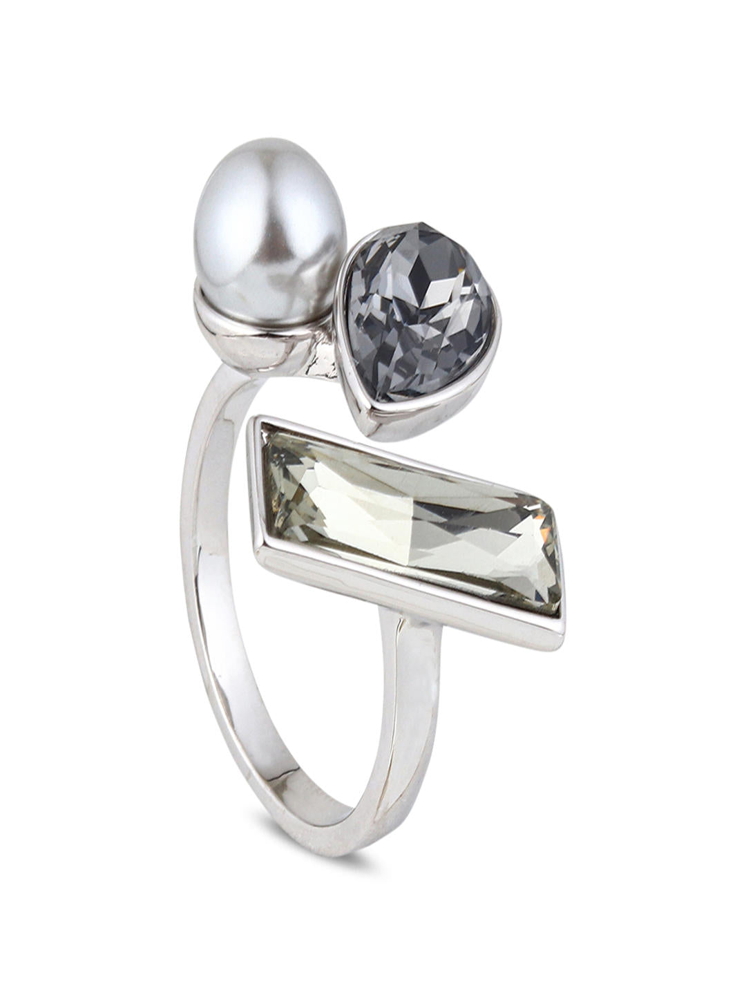 A modern three-stone design featuring a lustrous pearl, a smokey teardrop crystal, and a sleek rectangular gem — all set on a polished adjustable band. Elegant, bold, and effortlessly contemporary.