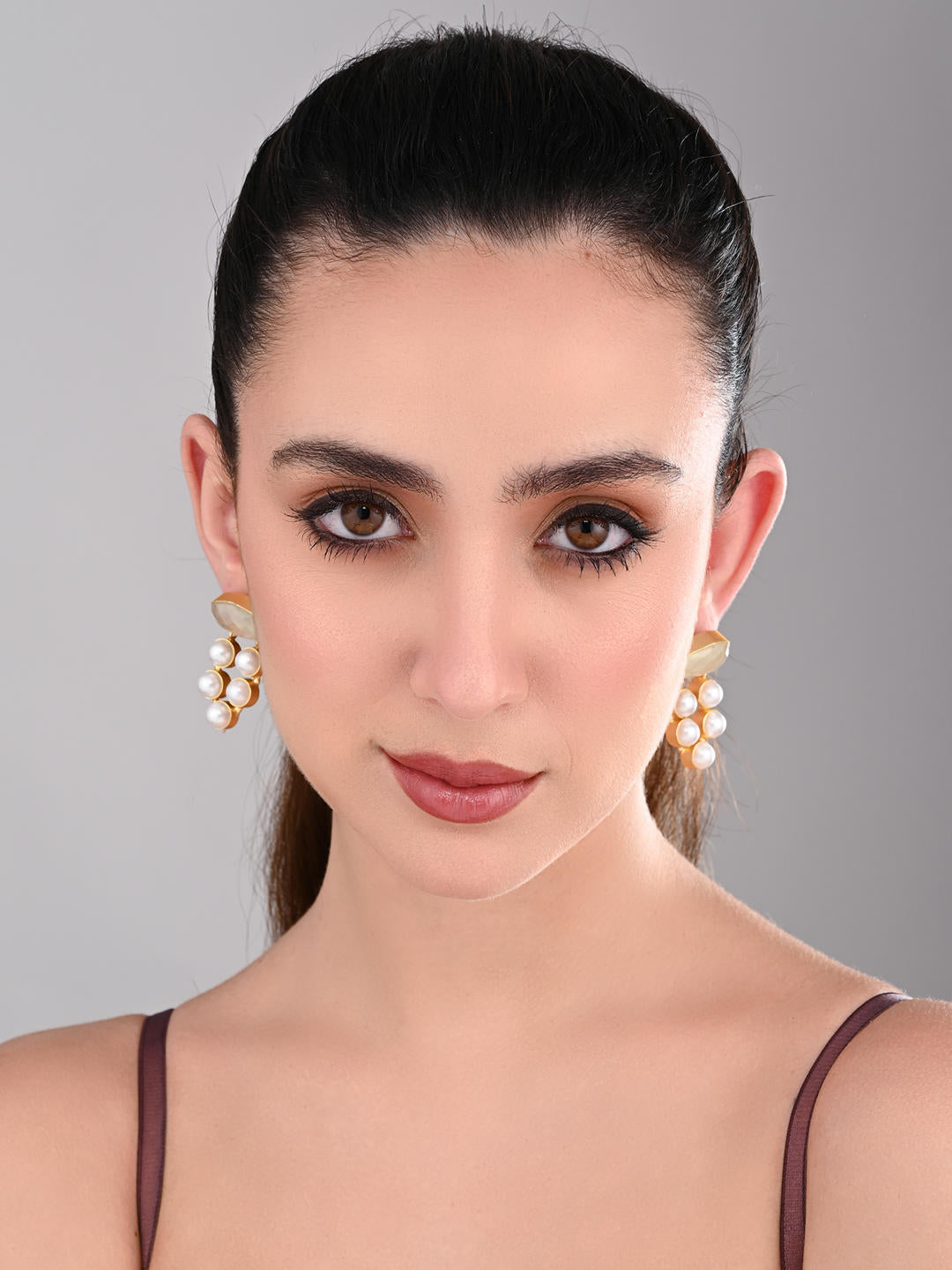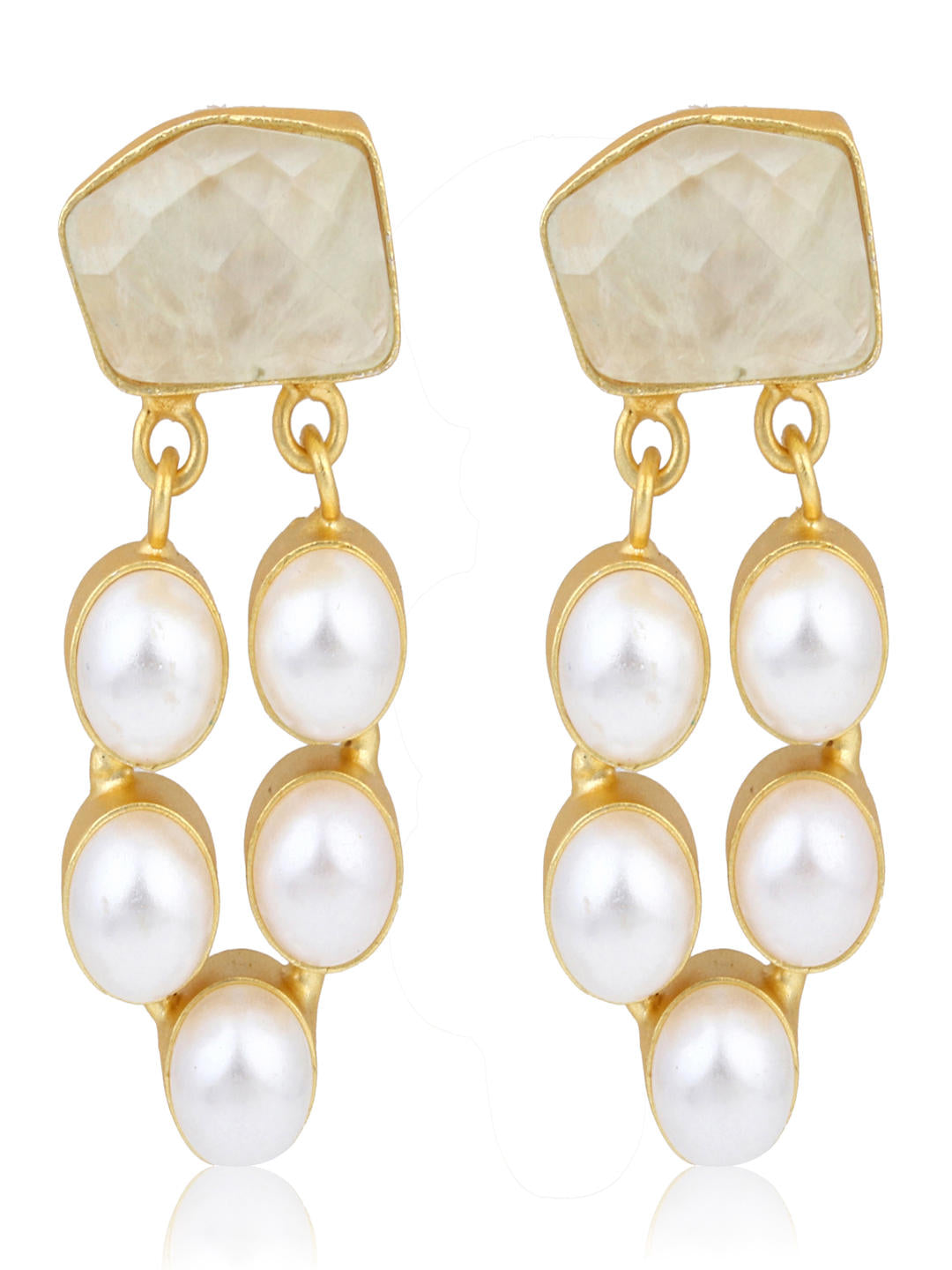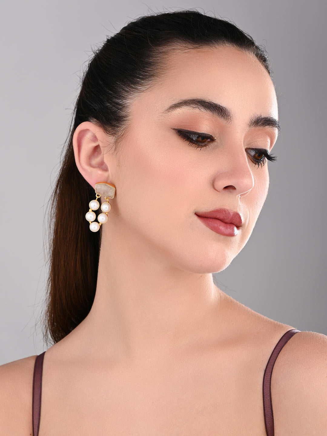 Elegant gold-plated earrings showcasing a geometric gemstone base with cascading pearls, offering a graceful and sophisticated charm.