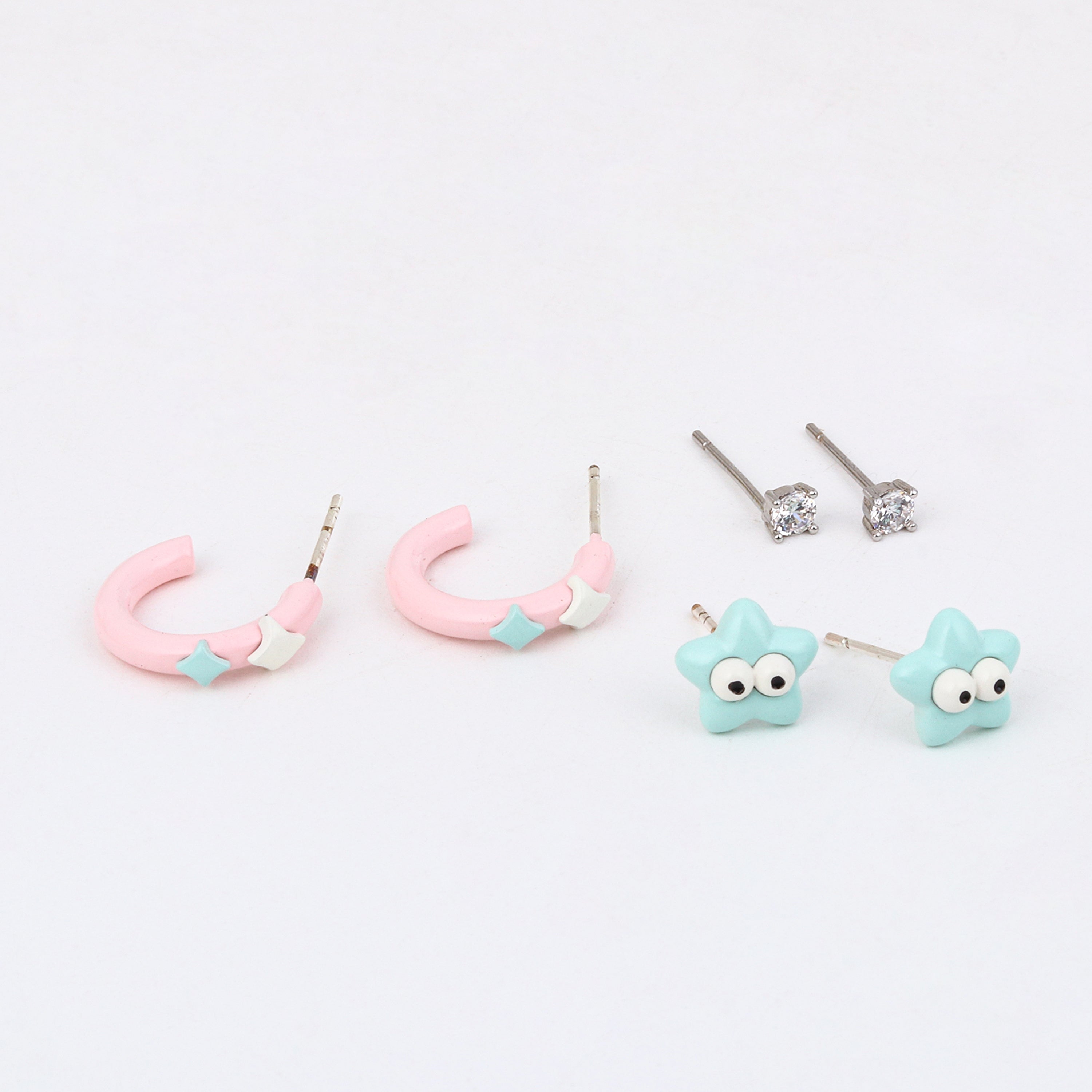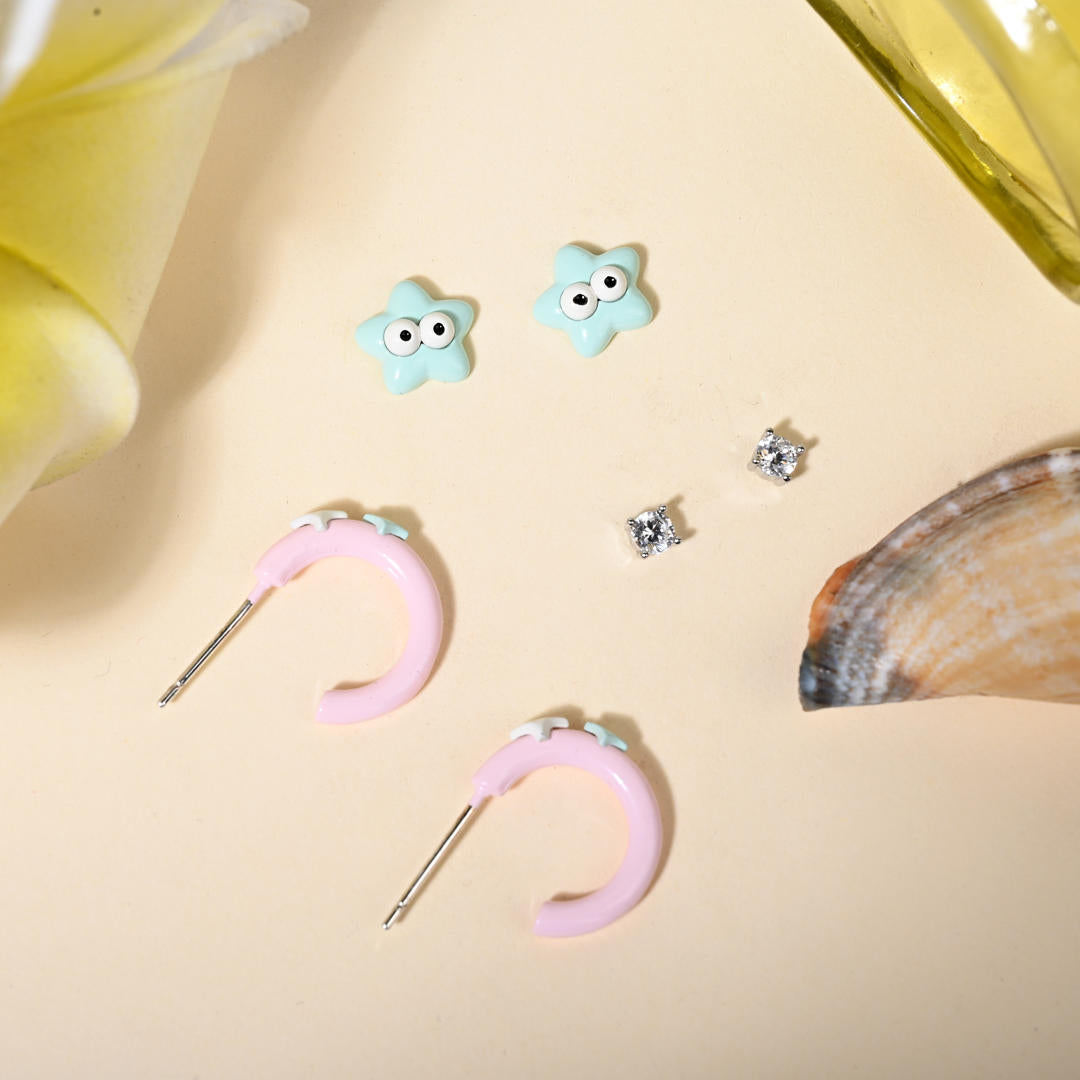 Dive into Fun! This charming 3-pair set features 925 Sterling Silver posts for comfort and safety. The pack includes: one pair of adorable Mint Starfish studs, one pair of tiny Silver Studs (likely star-shaped), and one pair of stylish Pink Enamel Mini-Hoops with a cute accent. Hypoallergenic and ready for any seaside adventure!