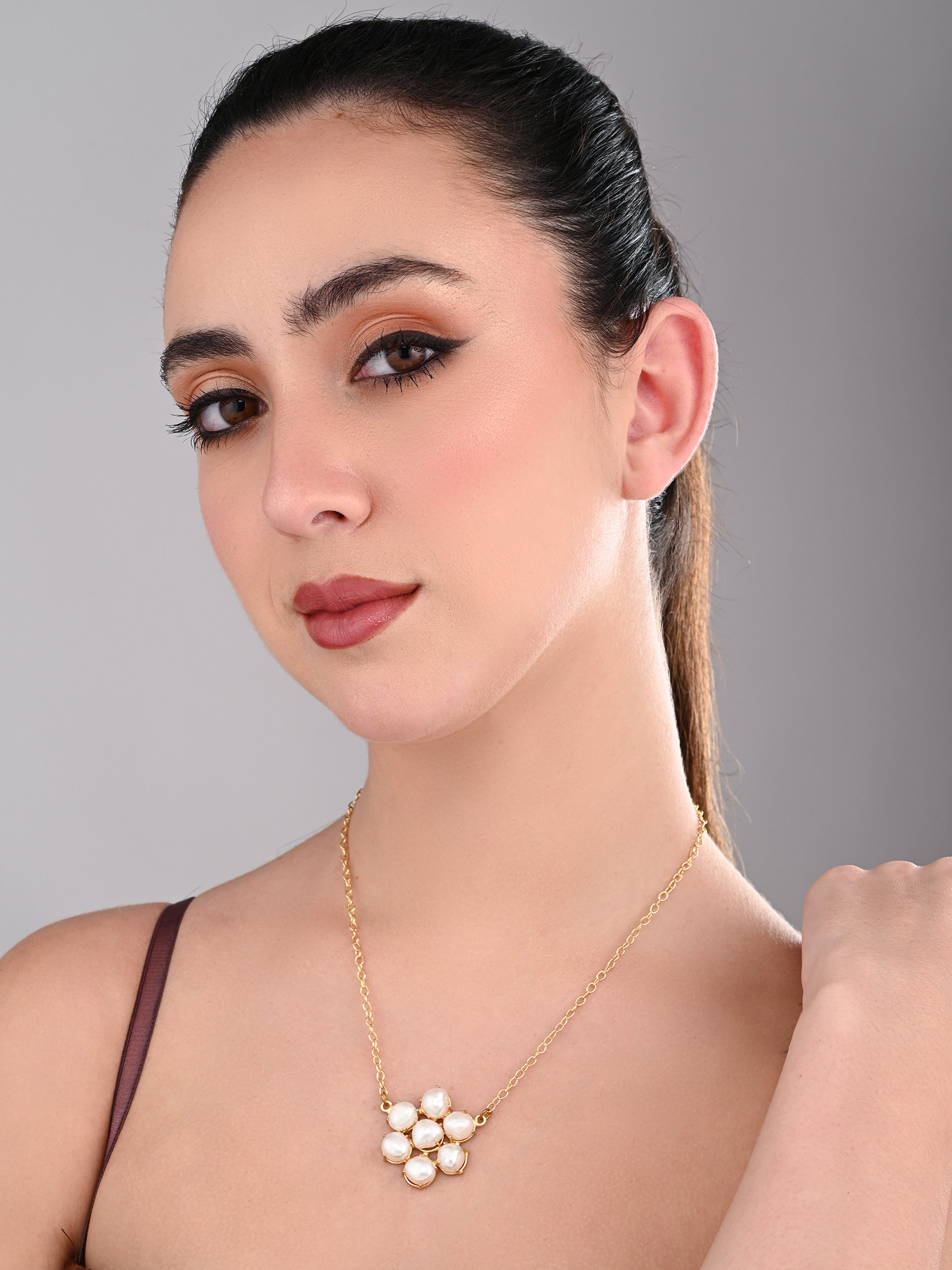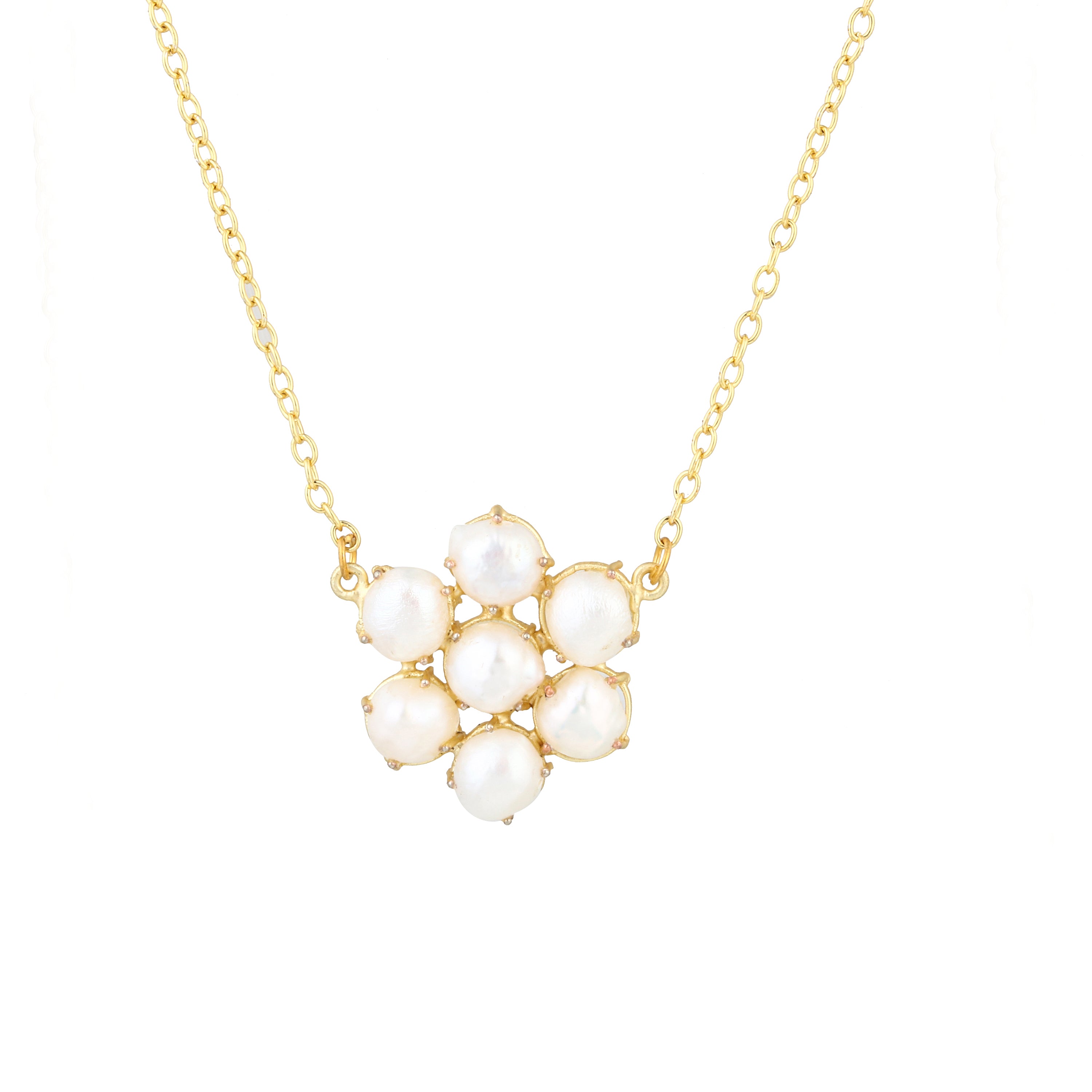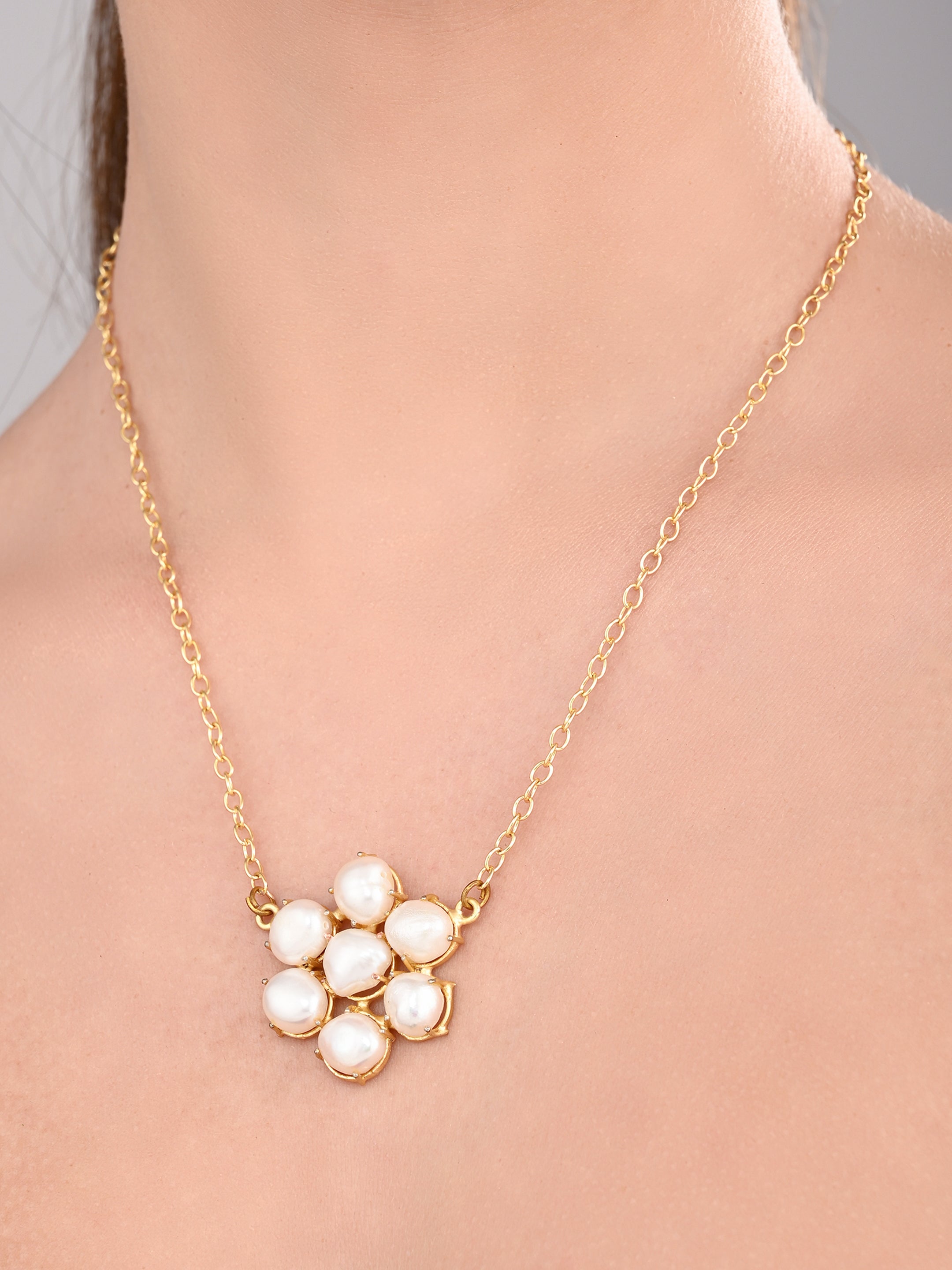 A delicate gold-chain necklace featuring a cluster of lustrous pearls arranged like a blooming flower — an elegant piece for timeless charm.
