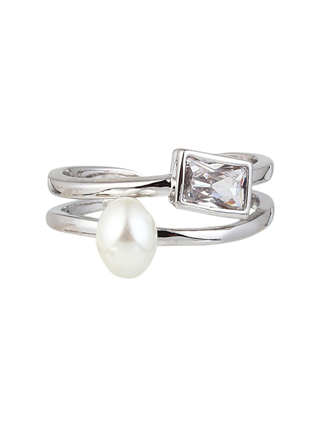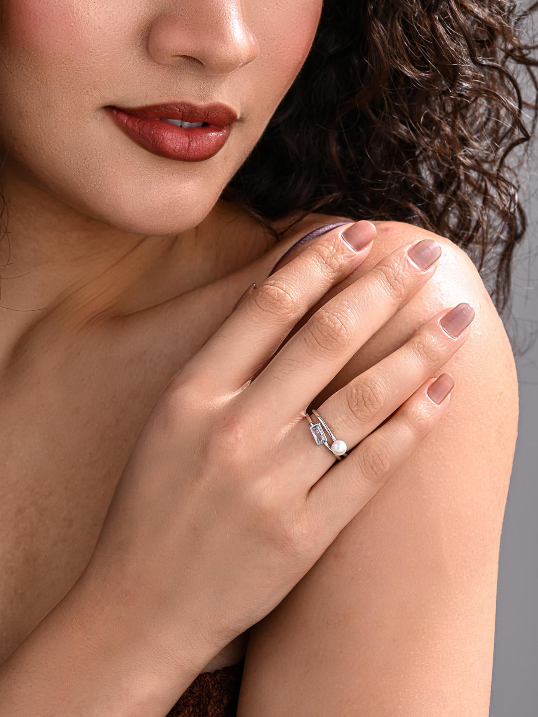 A modern fusion of elegance — featuring a luminous pearl paired with a sleek emerald-cut CZ stone on a glossy adjustable band. Sophisticated and minimal, this ring adds effortless luxury to everyday and occasion looks.