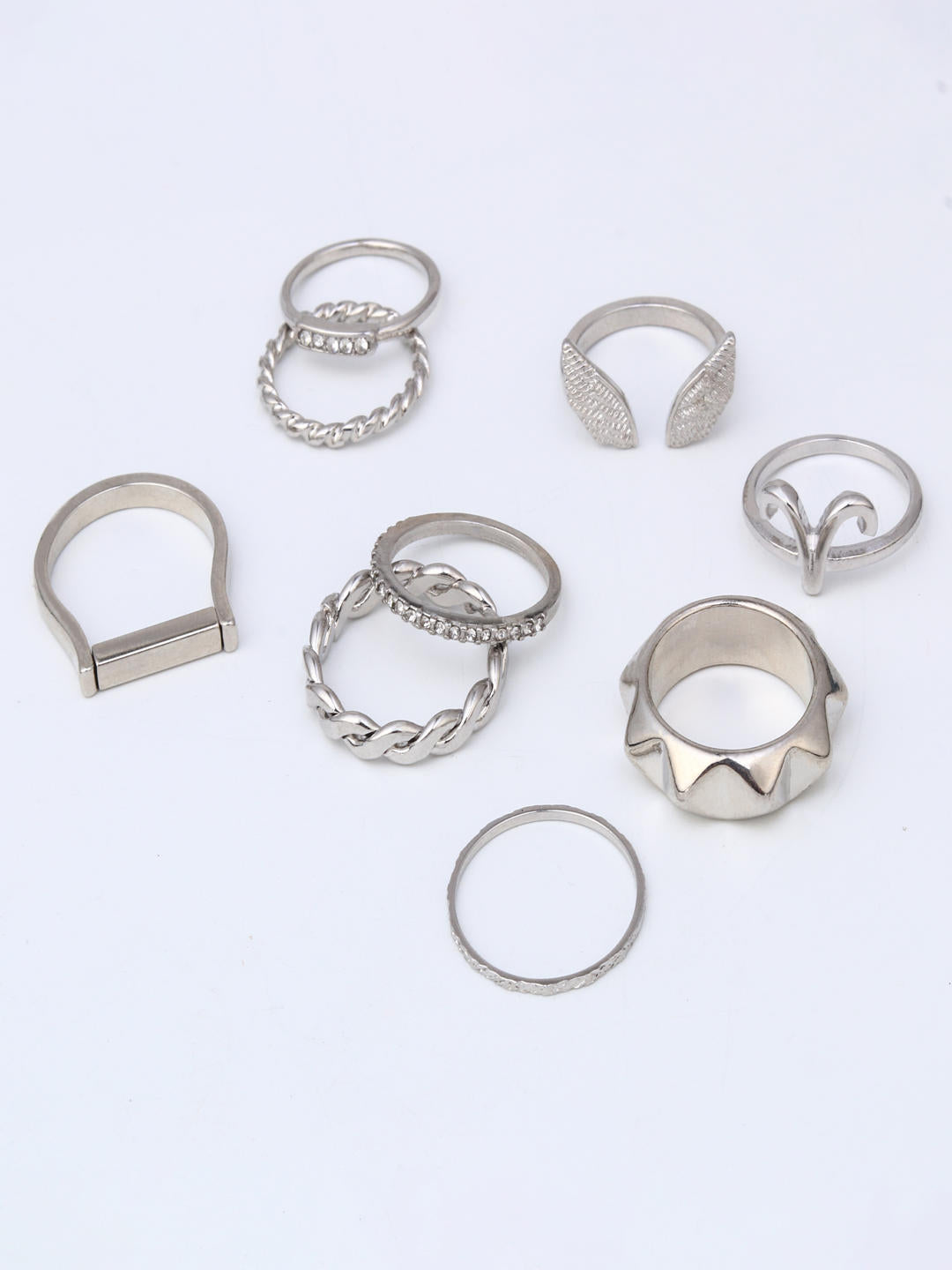 A curated mix of sculpted silhouettes, textured bands, and minimal silver rings for effortless stacking.