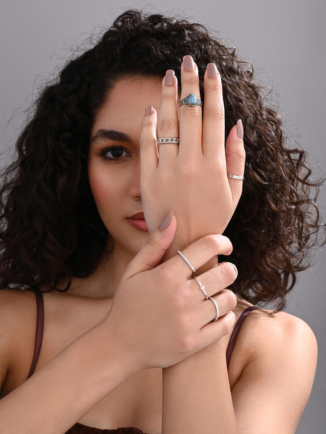 A refined mix of sleek silver bands, textured rings, and a statement blue gemstone piece.