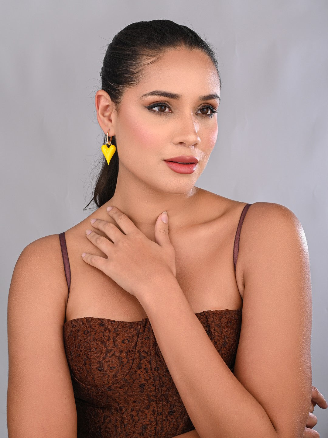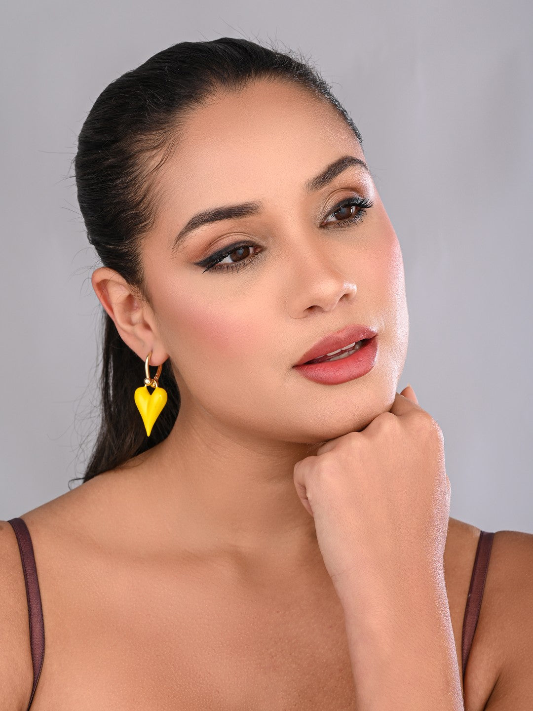 Charming heart-shaped drops in a vibrant yellow enamel finish, designed on sleek gold-tone hoops. Lightweight, cheerful, and easy to style from day to night.