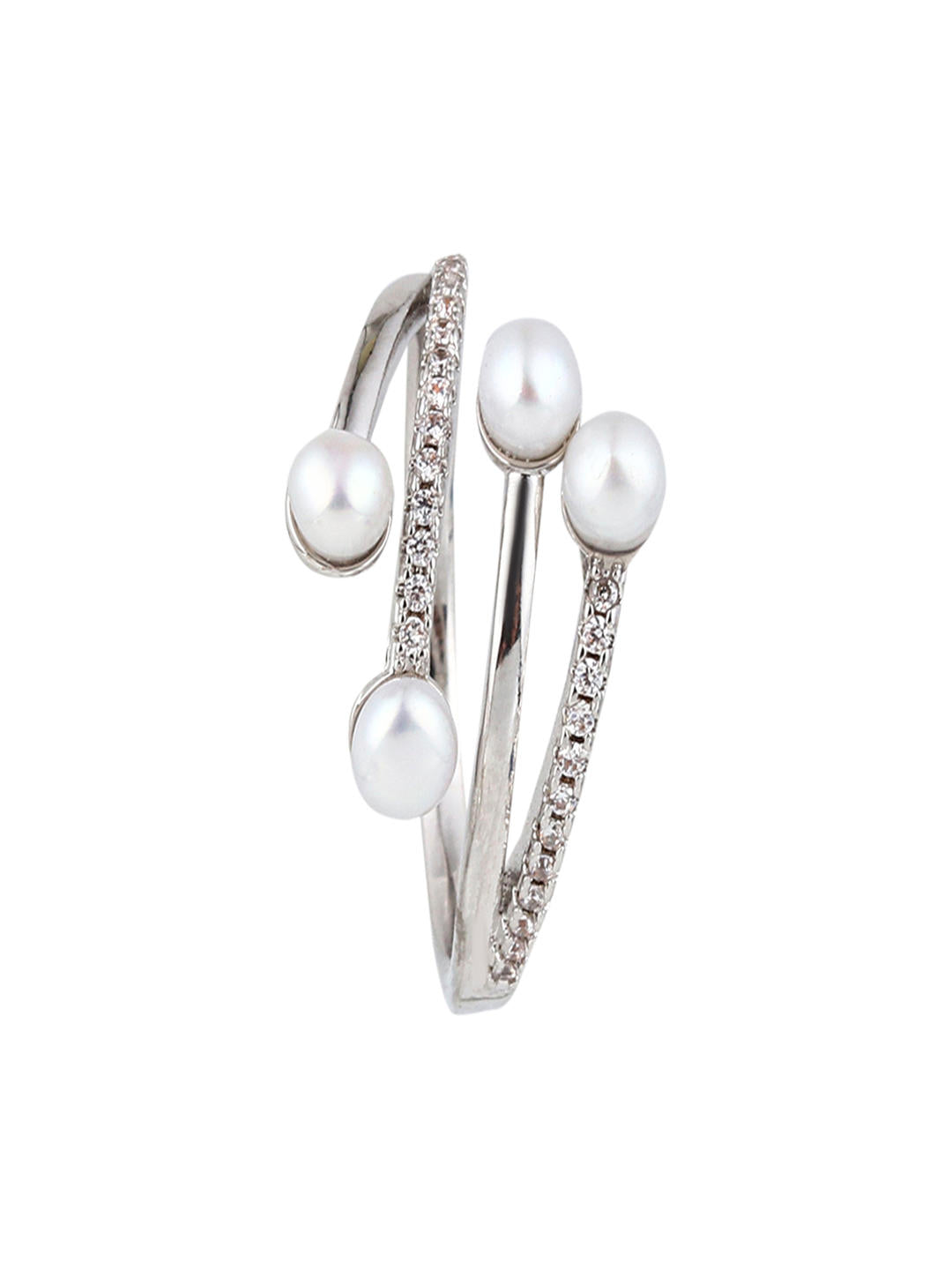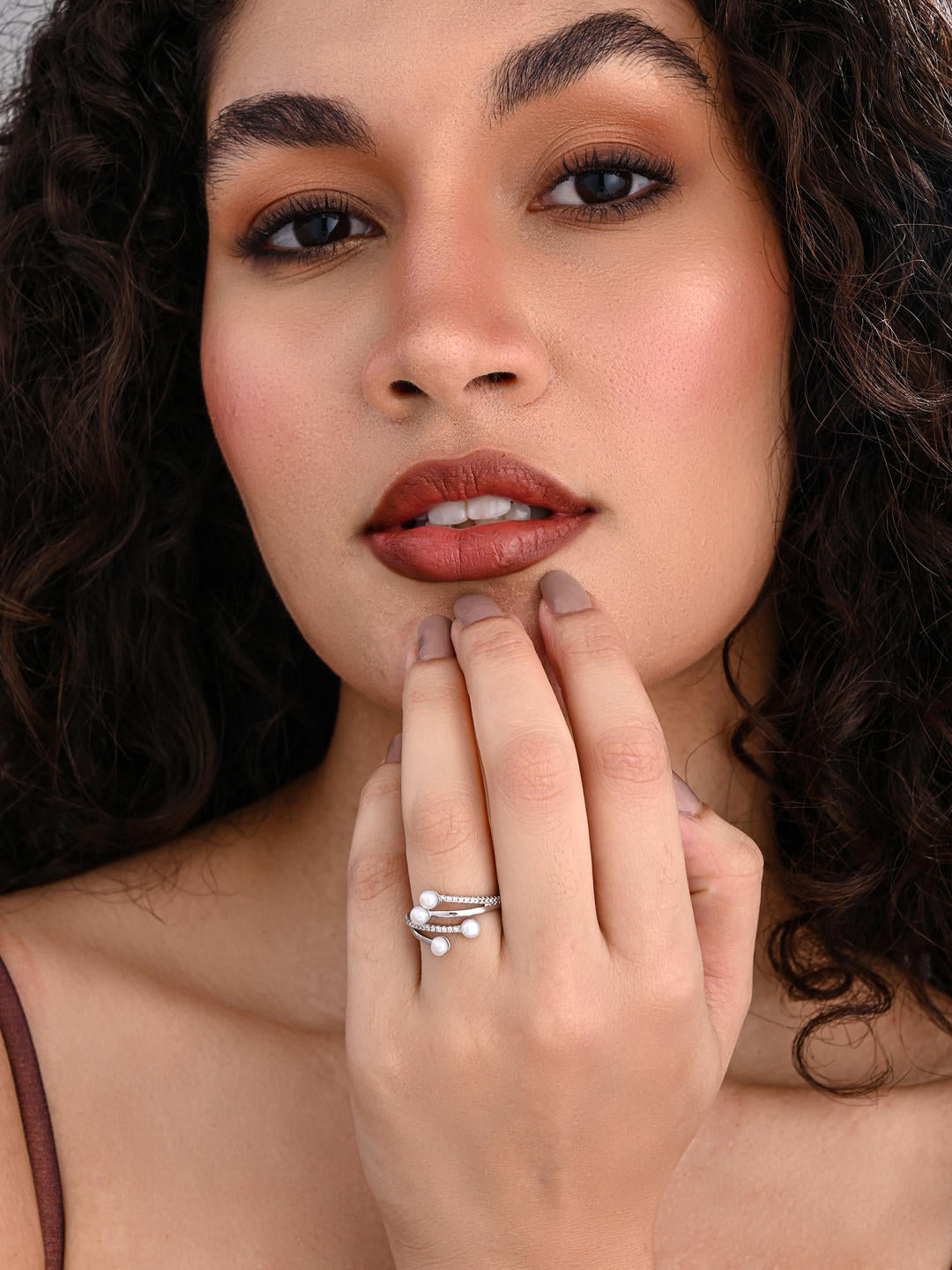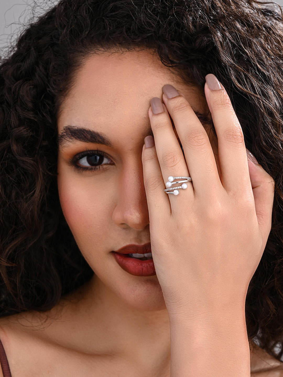 A sleek crossover silhouette adorned with three luminous pearls and a row of sparkling CZ stones. Modern yet graceful, this adjustable silver ring adds a touch of sophistication to both everyday and occasion wear.