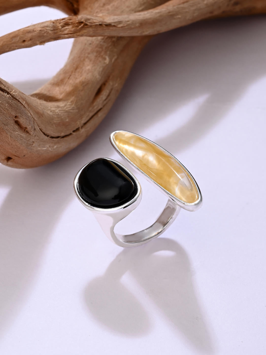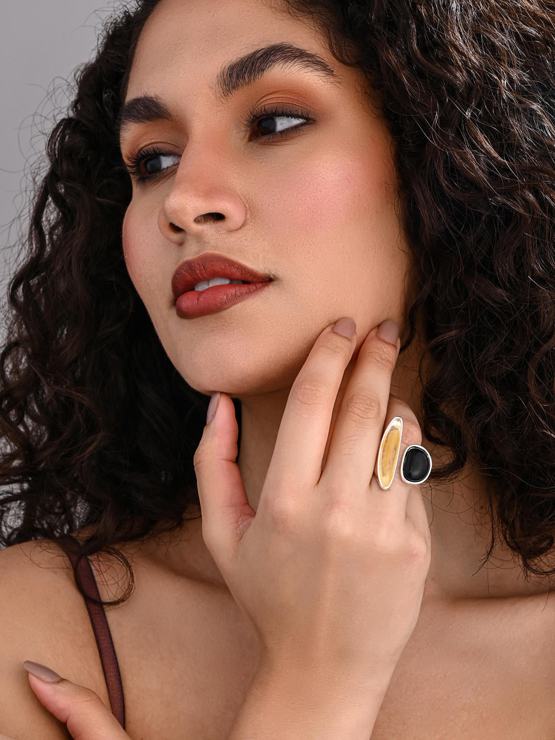 A striking fusion of glossy black stone and warm honey-toned shell, set on a polished adjustable band. Bold yet elegant, this statement piece symbolizes balance — a perfect blend of contrast and harmony.